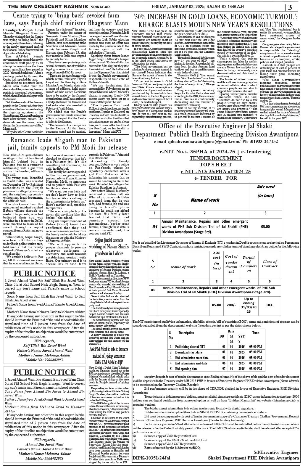 Crescent Kashmir 03-01-2025 Page: 3 January 03, 2025 << First << 3 >> Last >> Page 1Page 2Page 3Page 4Page 5Page 6Page 7Page 8 × Crescent Kashmir 03-01-2025 << First << 3 >> Last >> CK 1CK 2CK 3CK 4CK 5CK 6CK 7CK 8 CK 3