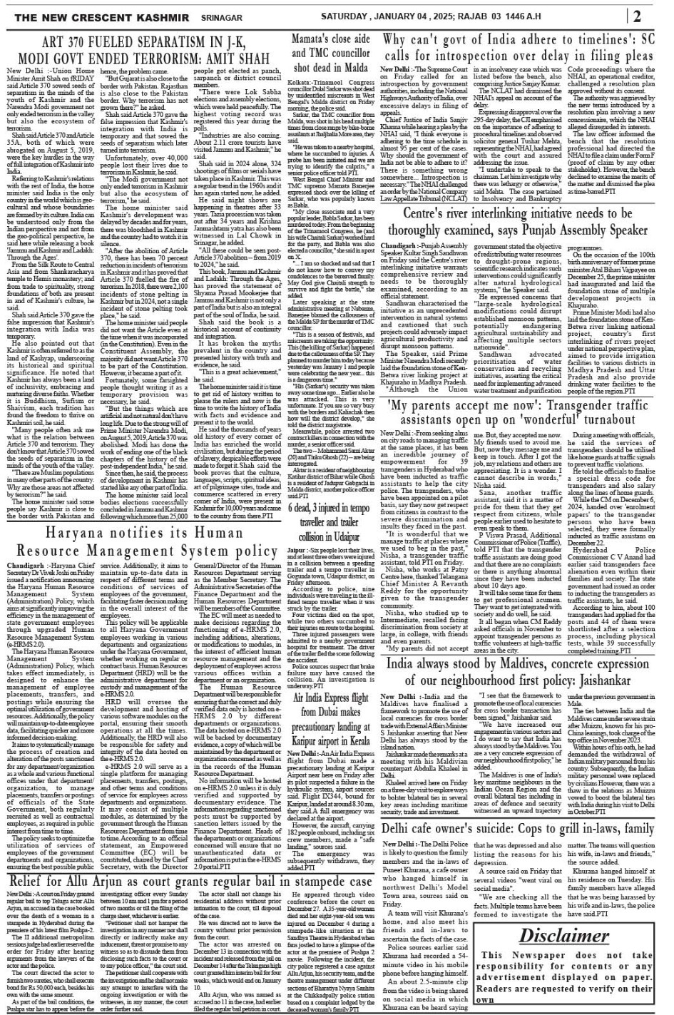 Crescent Kashmir 04-01-2025 Page: 2 January 04, 2025 << First << 2 >> Last >> Page 1Page 2Page 3Page 4Page 5Page 6Page 7Page 8 × Crescent Kashmir 04-01-2025 << First << 2 >> Last >> CK 1CK 2CK 3CK 4CK 5CK 6CK 7CK 8 CK 2