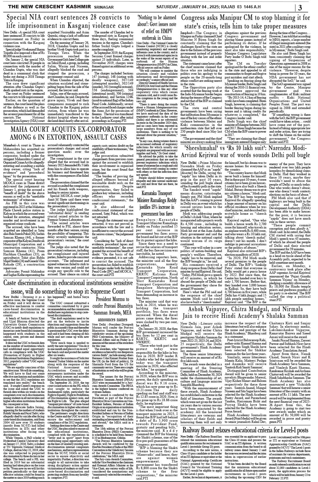 Crescent Kashmir 04-01-2025 Page: 3 January 04, 2025 << First << 3 >> Last >> Page 1Page 2Page 3Page 4Page 5Page 6Page 7Page 8 × Crescent Kashmir 04-01-2025 << First << 3 >> Last >> CK 1CK 2CK 3CK 4CK 5CK 6CK 7CK 8 CK 3