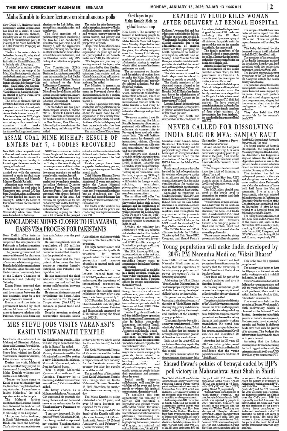 Crescent Kashmir 13-01-2025 Page: 2 January 13, 2025 << First << 2 >> Last >> Page 1Page 2Page 3Page 4Page 5Page 6Page 7Page 8 × Crescent Kashmir 13-01-2025 << First << 2 >> Last >> CK 1CK 2CK 3CK 4CK 5CK 6CK 7CK 8 CK 2