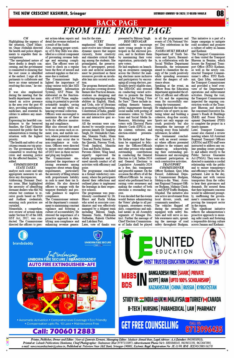 Crescent Kashmir 18-01-2025 Page: 8 January 18, 2025 << First << 8 >> Last >> Page 1Page 2Page 3Page 4Page 5Page 6Page 7Page 8 × Crescent Kashmir 18-01-2025 << First << 8 >> Last >> CK 1CK 2CK 3CK 4CK 5CK 6CK 7CK 8 CK 8