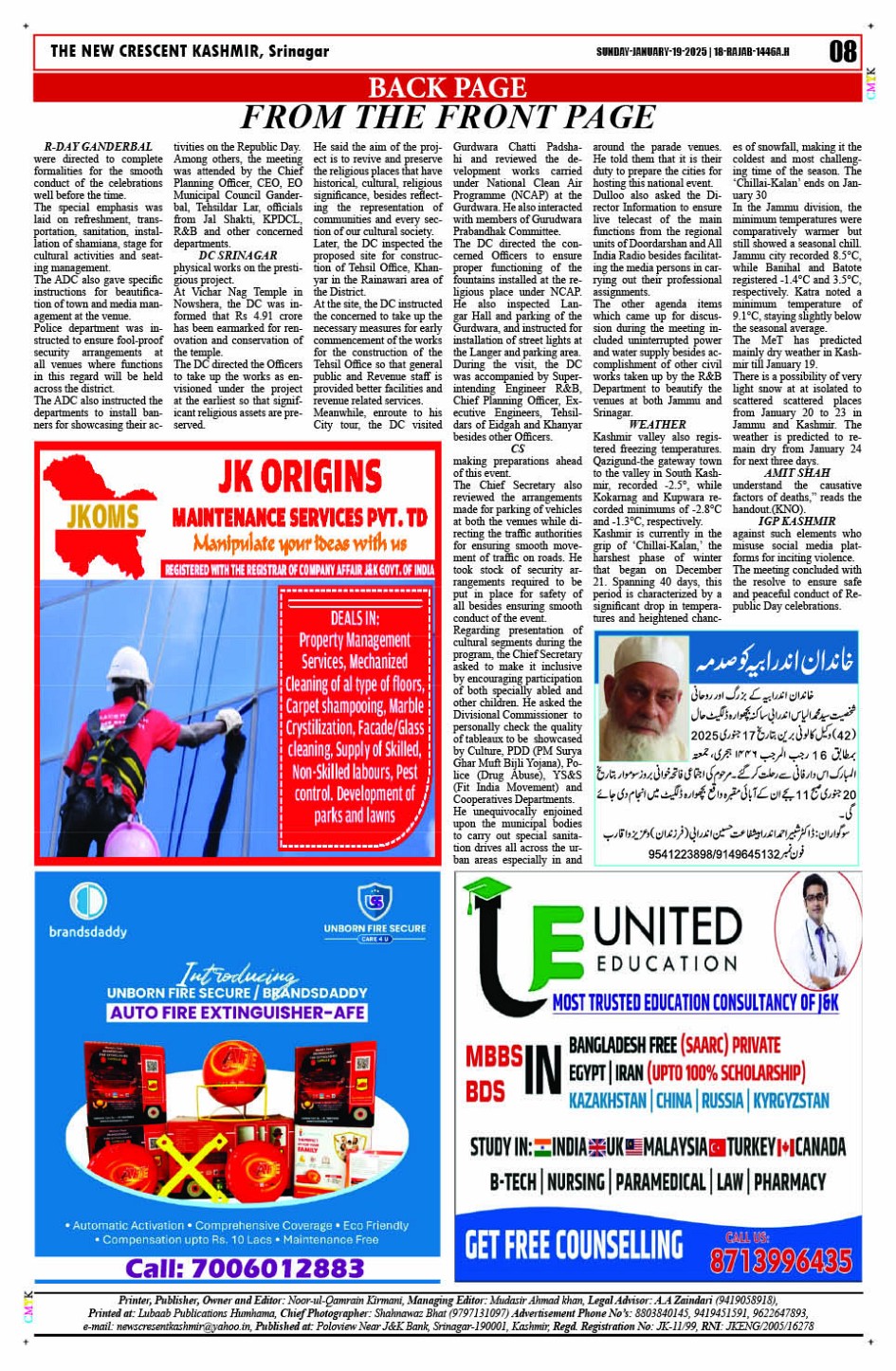 Crescent Kashmir 19-01-2025 Page: 8 January 19, 2025 << First << 8 >> Last >> Page 1Page 2Page 3Page 4Page 5Page 6Page 7Page 8 × Crescent Kashmir 19-01-2025 << First << 8 >> Last >> CK 1CK 2CK 3CK 4CK 5CK 6CK 7CK 8 CK 8