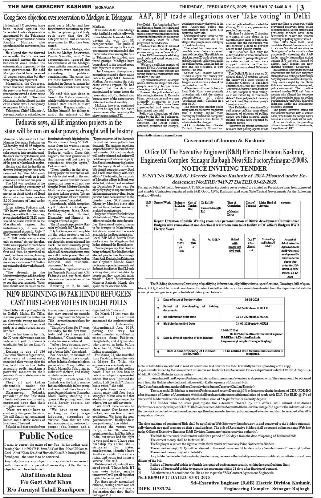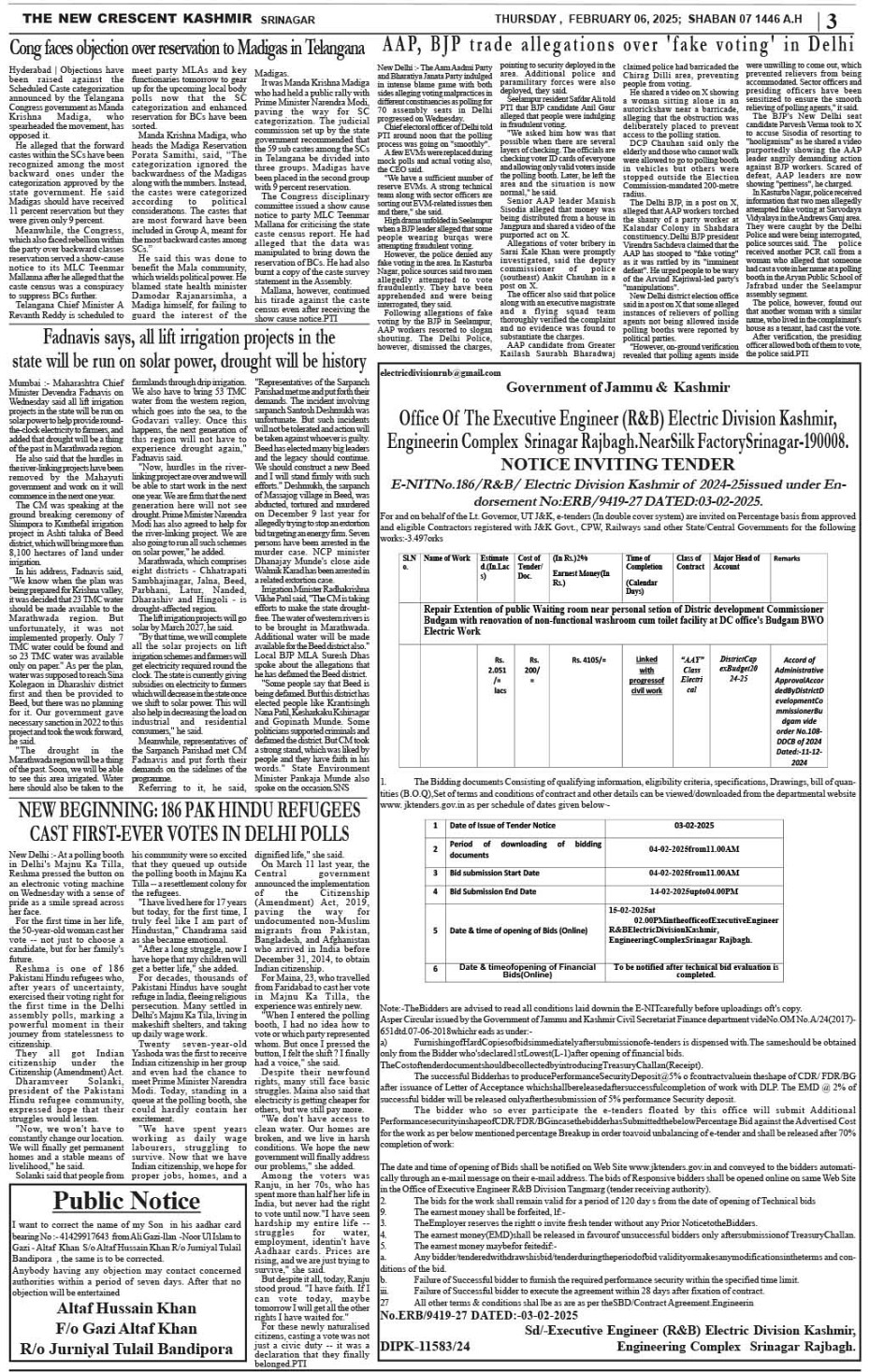 Crescent Kashmir 06-02-2025 Page: 3 February 06, 2025 << First << 3 >> Last >> Page 1Page 2Page 3Page 4Page 5Page 6Page 7Page 8 × Crescent Kashmir 06-02-2025 << First << 3 >> Last >> CK 1CK 2CK 3CK 4CK 5CK 6CK 7CK 8 CK 3