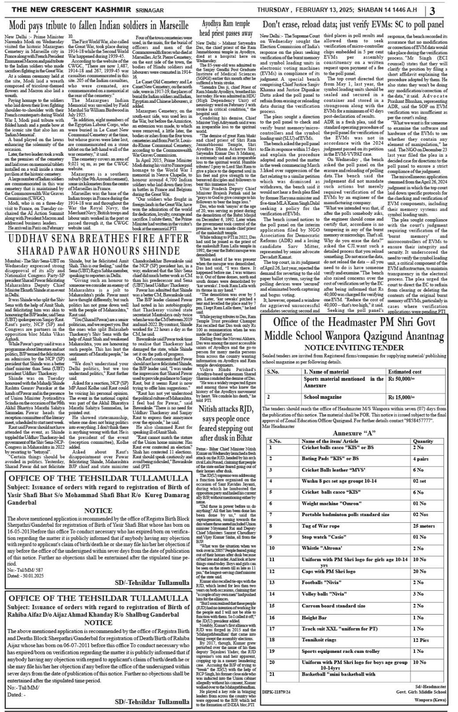 Crescent Kashmir 13-02-2025 Page: 3 February 13, 2025 << First << 3 >> Last >> Page 1Page 2Page 3Page 4Page 5Page 6Page 7Page 8 × Crescent Kashmir 13-02-2025 << First << 3 >> Last >> CK 1CK 2CK 3CK 4CK 5CK 6CK 7CK 8 CK 3
