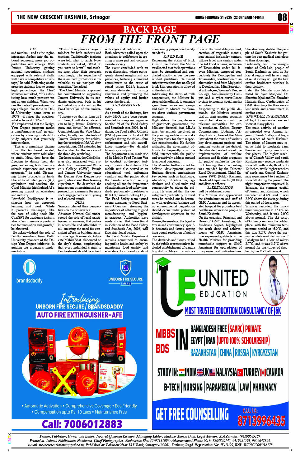 Crescent Kashmir 21-02-2025 Page: 8 February 21, 2025 << First << 8 >> Last >> Page 1Page 2Page 3Page 4Page 5Page 6Page 7Page 8 × Crescent Kashmir 21-02-2025 << First << 8 >> Last >> CK 1CK 2CK 3CK 4CK 5CK 6CK 7CK 8 CK 8