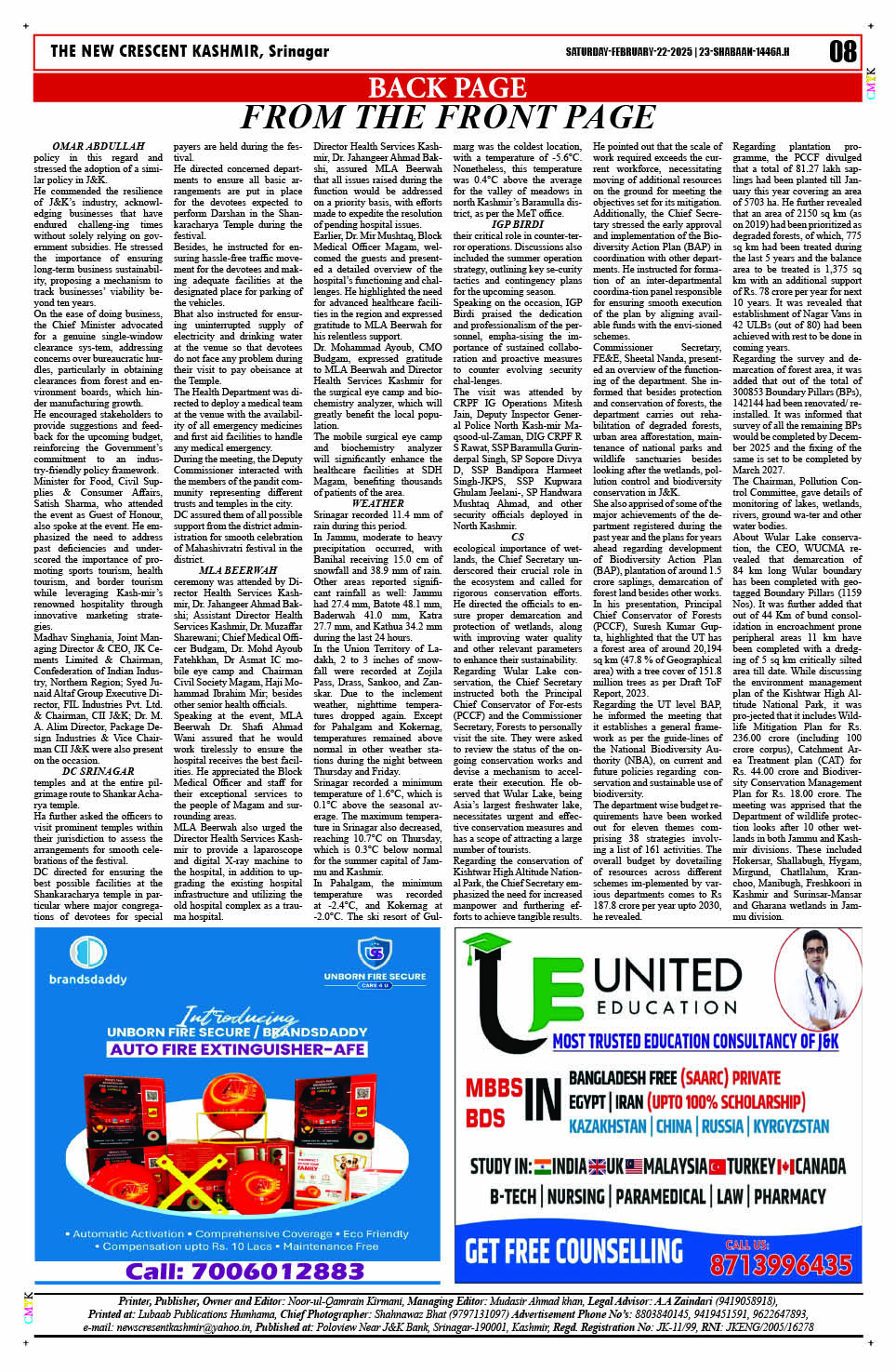 Crescent Kashmir 22-02-2025 Page: 8 February 22, 2025 << First << 8 >> Last >> Page 1Page 2Page 3Page 4Page 5Page 6Page 7Page 8 × Crescent Kashmir 22-02-2025 << First << 8 >> Last >> CK 1CK 2CK 3CK 4CK 5CK 6CK 7CK 8 CK 8