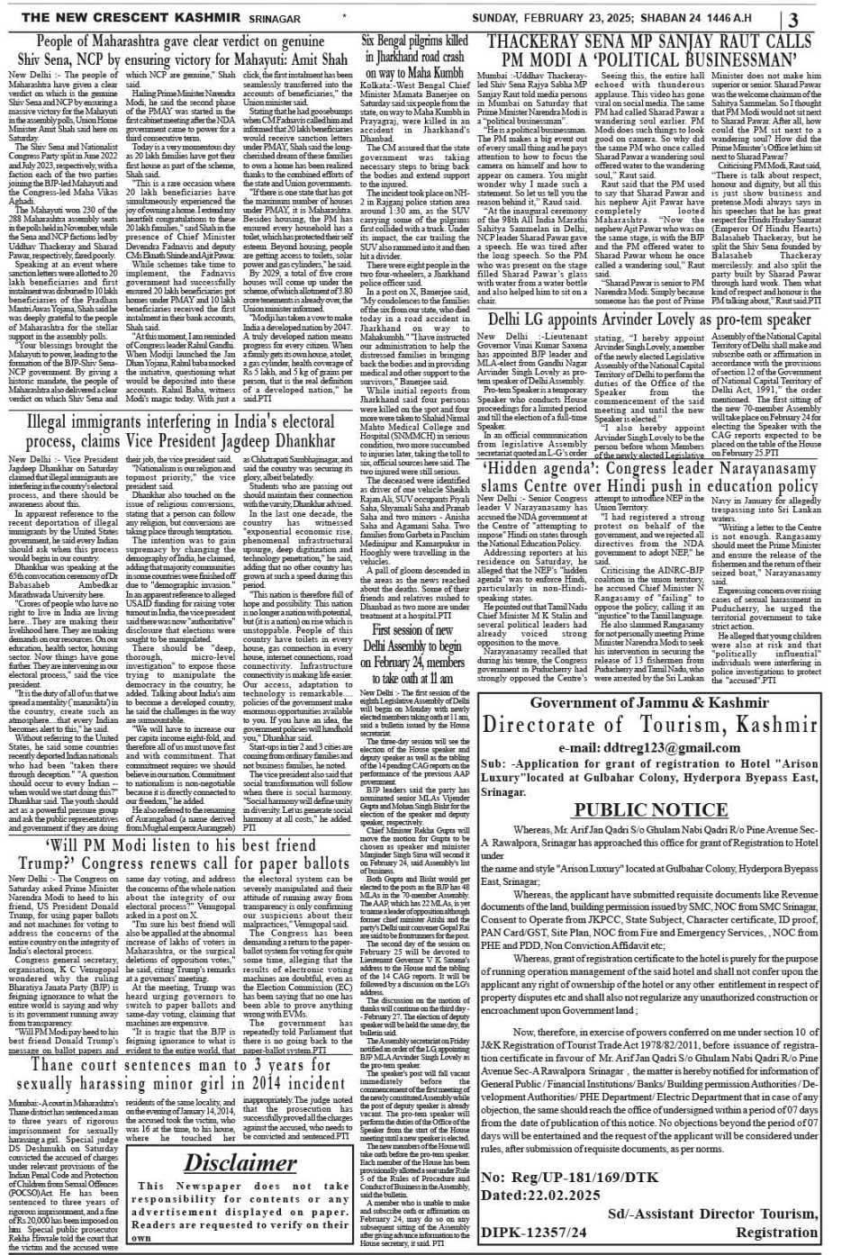 Crescent Kashmir 23-02-2025 Page: 3 February 23, 2025 << First << 3 >> Last >> Page 1Page 2Page 3Page 4Page 5Page 6Page 7Page 8 × Crescent Kashmir 23-02-2025 << First << 3 >> Last >> CK 1CK 2CK 3CK 4CK 5CK 6CK 7CK 8 CK 3