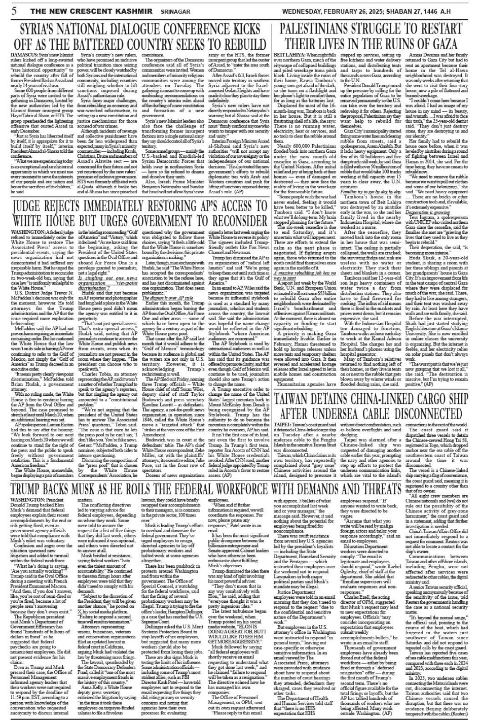 Crescent Kashmir 26-02-2025 Page: 5 February 26, 2025 << First << 5 >> Last >> Page 1Page 2Page 3Page 4Page 5Page 6Page 7Page 8 × Crescent Kashmir 26-02-2025 << First << 5 >> Last >> CK 1CK 2CK 3CK 4CK 5CK 6CK 7CK 8 CK 5