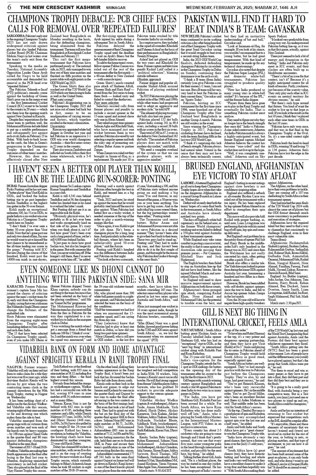 Crescent Kashmir 26-02-2025 Page: 6 February 26, 2025 << First << 6 >> Last >> Page 1Page 2Page 3Page 4Page 5Page 6Page 7Page 8 × Crescent Kashmir 26-02-2025 << First << 6 >> Last >> CK 1CK 2CK 3CK 4CK 5CK 6CK 7CK 8 CK 6