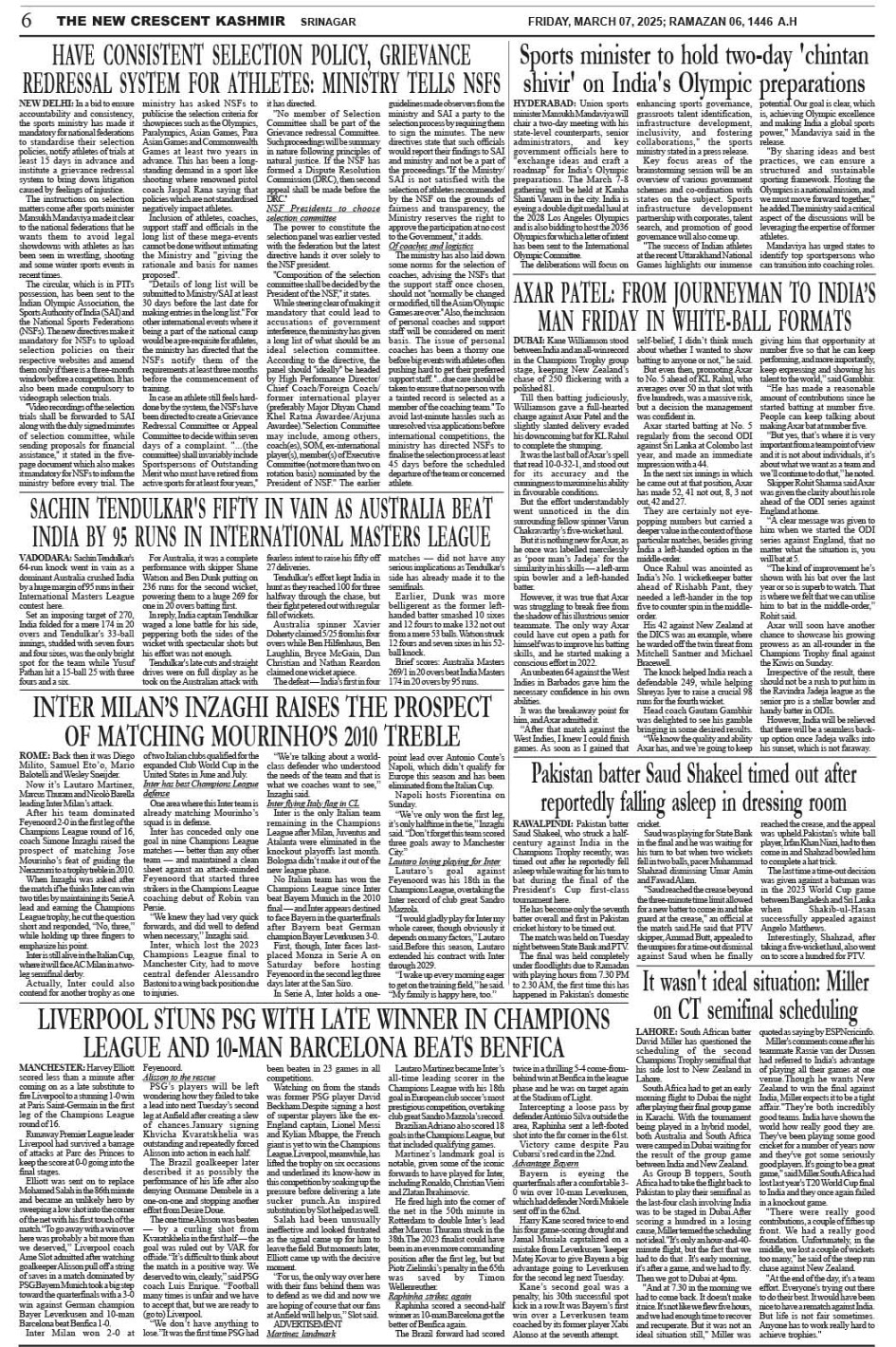 Crescent Kashmir 07-03-2025 Page: 6 March 07, 2025 << First << 6 >> Last >> Page 1Page 2Page 3Page 4Page 5Page 6Page 7Page 8 × Crescent Kashmir 07-03-2025 << First << 6 >> Last >> CK 1CK 2CK 3CK 4CK 5CK 6CK 7CK 8 CK 6