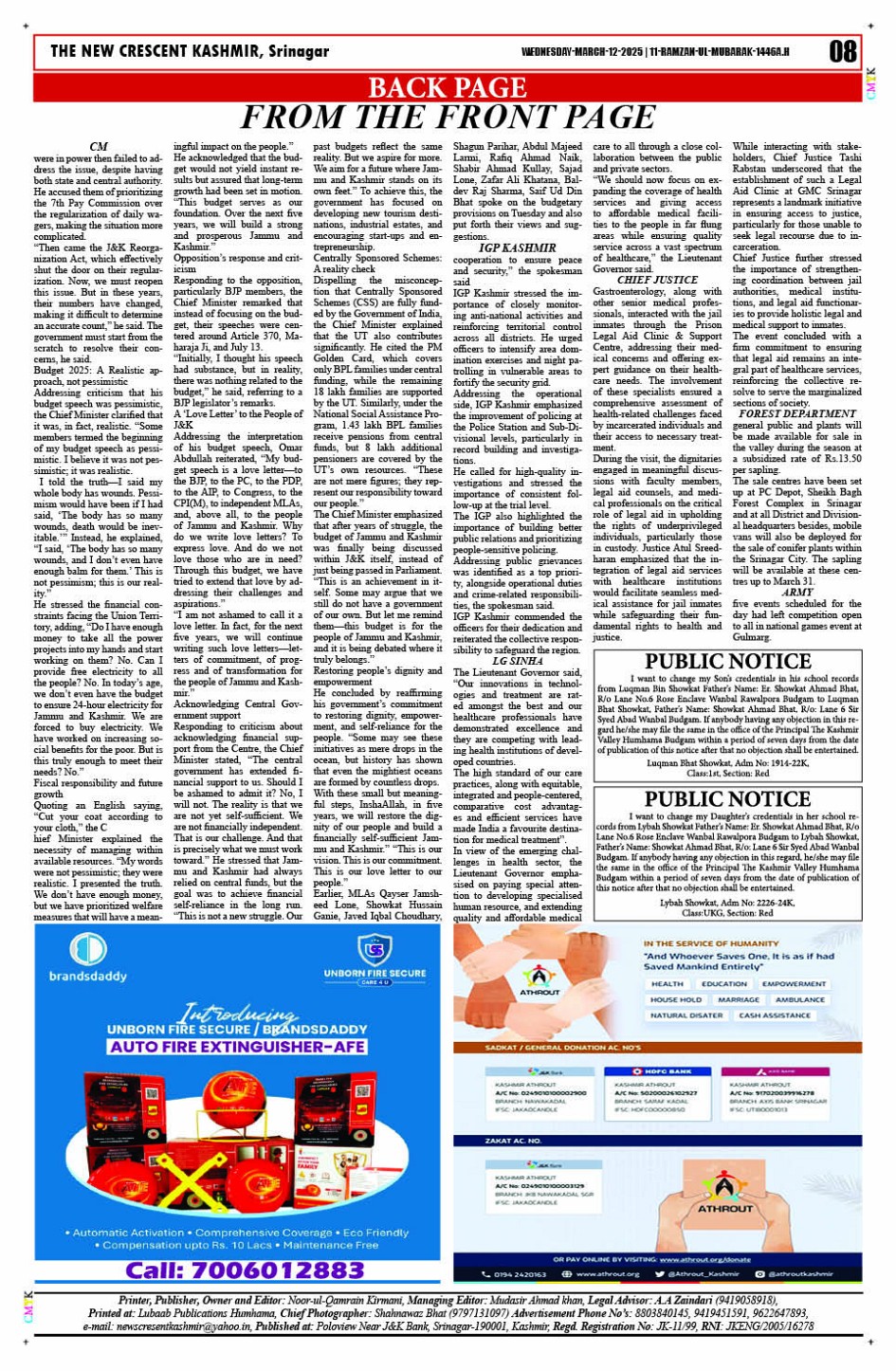 Crescent Kashmir 12-03-2025 Page: 8 March 12, 2025 << First << 8 >> Last >> Page 1Page 2Page 3Page 4Page 5Page 6Page 7Page 8 × Crescent Kashmir 12-03-2025 << First << 8 >> Last >> CK 1CK 2CK 3CK 4CK 5CK 6CK 7CK 8 CK 8