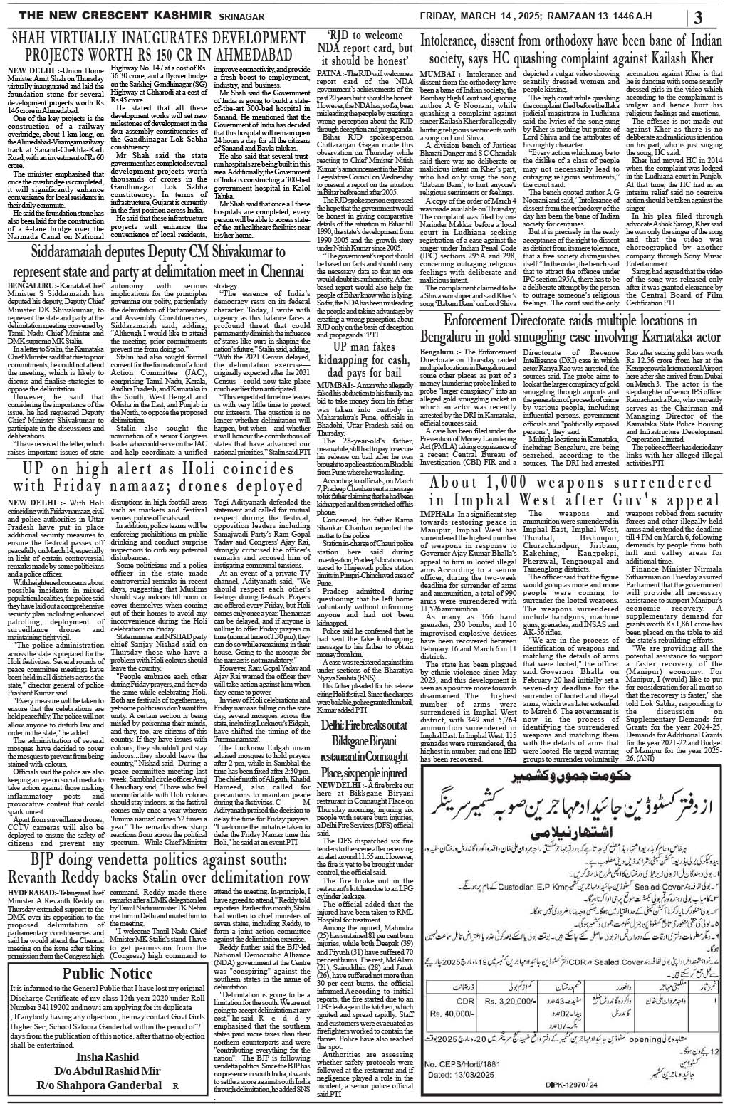 Crescent Kashmir 14-03-2025 Page: 3 March 14, 2025 << First << 3 >> Last >> Page 1Page 2Page 3Page 4Page 5Page 6Page 7Page 8 × Crescent Kashmir 14-03-2025 << First << 3 >> Last >> CK 1CK 2CK 3CK 4CK 5CK 6CK 7CK 8 CK 3