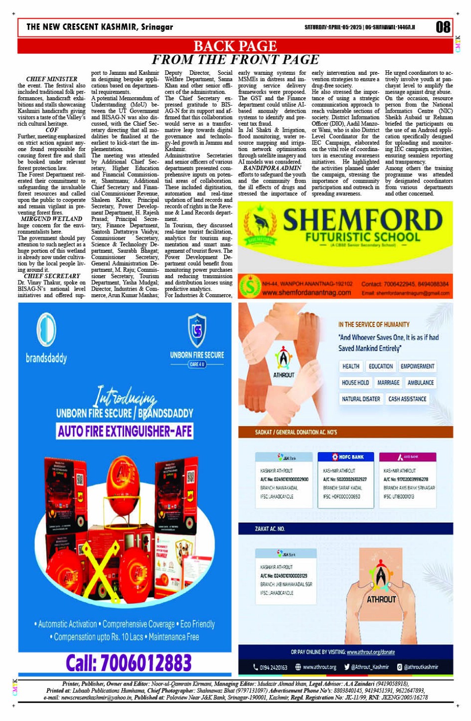 Crescent Kashmir 05-04-2025 Page: 8 April 05, 2025 << First << 8 >> Last >> Page 1Page 2Page 3Page 4Page 5Page 6Page 7Page 8 × Crescent Kashmir 05-04-2025 << First << 8 >> Last >> CK 1CK 2CK 3CK 4CK 5CK 6CK 7CK 8 CK 8