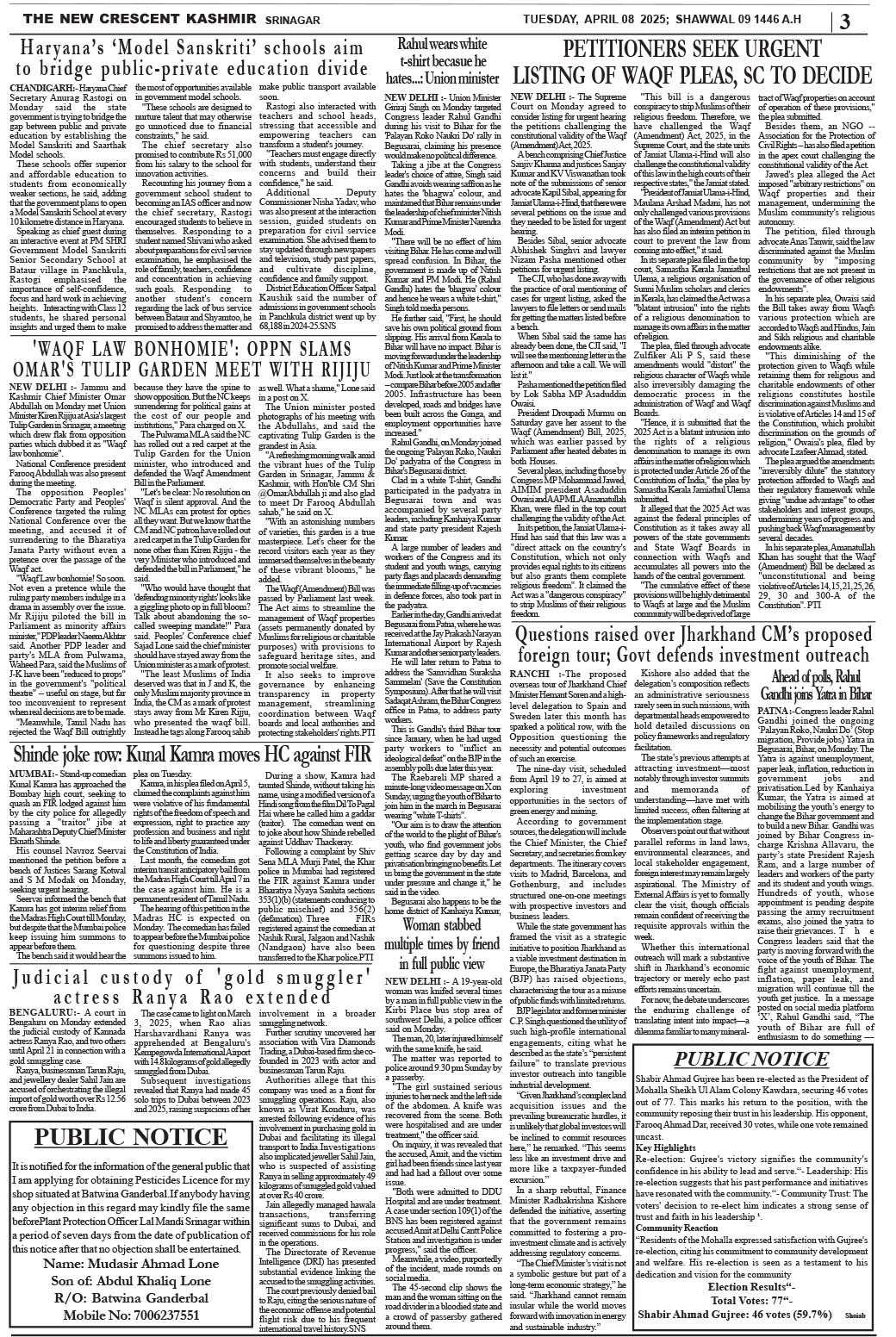Crescent Kashmir 08-04-2025 Page: 3 April 08, 2025 << First << 3 >> Last >> Page 1Page 2Page 3Page 4Page 5Page 6Page 7Page 8 × Crescent Kashmir 08-04-2025 << First << 3 >> Last >> CK 1CK 2CK 3CK 4CK 5CK 6CK 7CK 8 CK 3