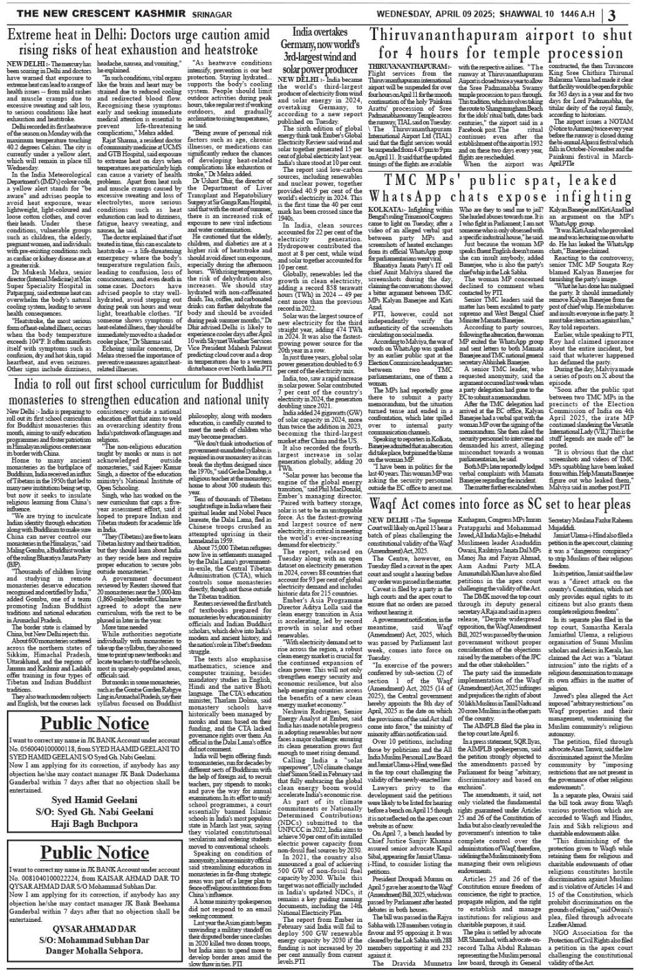 Crescent Kashmir 09-04-2025 Page: 3 April 09, 2025 << First << 3 >> Last >> Page 1Page 2Page 3Page 4Page 5Page 6Page 7Page 8 × Crescent Kashmir 09-04-2025 << First << 3 >> Last >> CK 1CK 2CK 3CK 4CK 5CK 6CK 7CK 8 CK 3