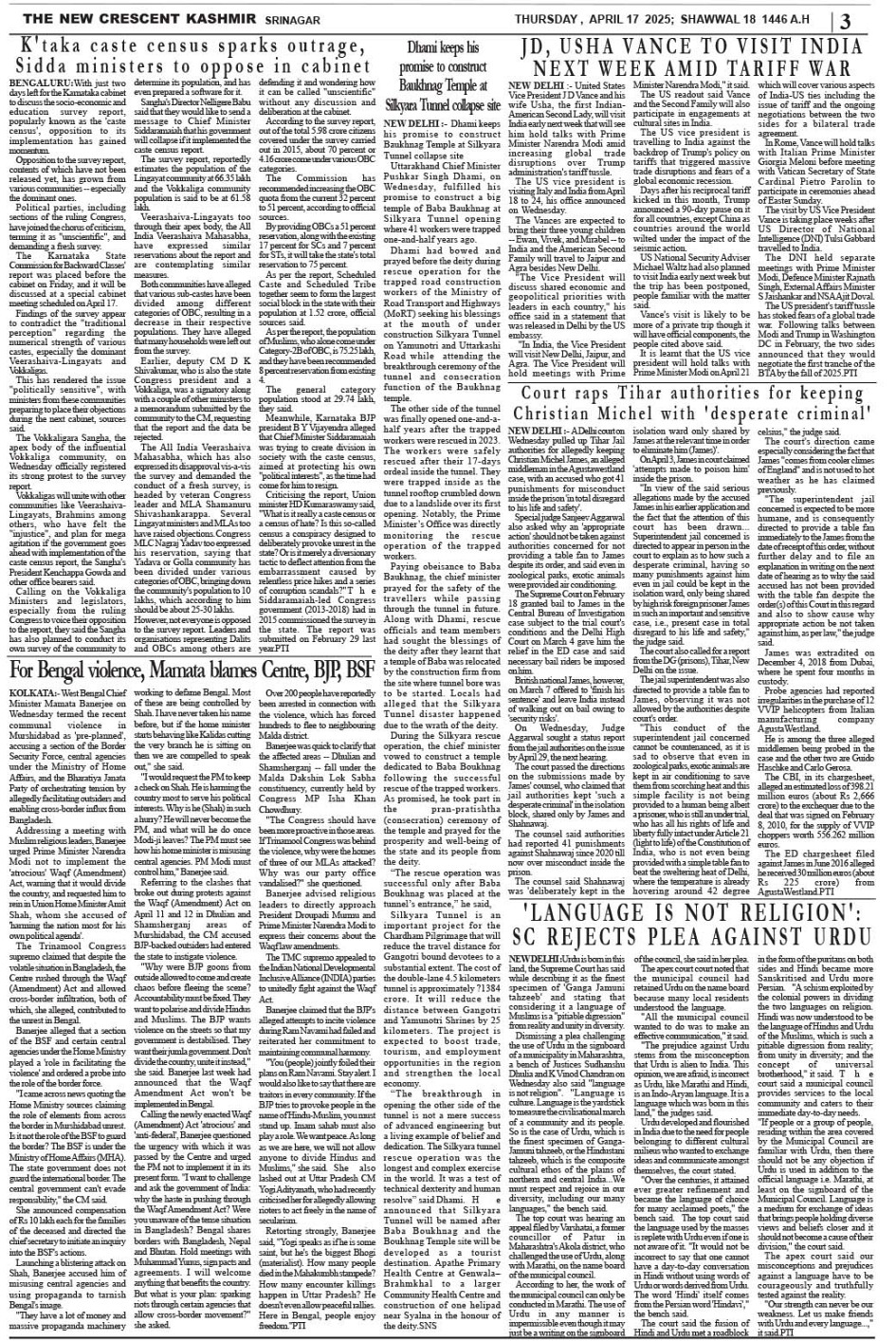 Crescent Kashmir 17-04-2025 Page: 3 April 17, 2025 << First << 3 >> Last >> Page 1Page 2Page 3Page 4Page 5Page 6Page 7Page 8 × Crescent Kashmir 17-04-2025 << First << 3 >> Last >> CK 1CK 2CK 3CK 4CK 5CK 6CK 7CK 8 CK 3