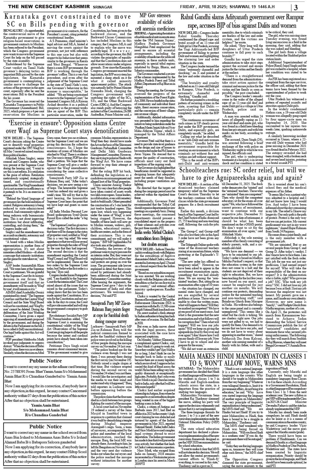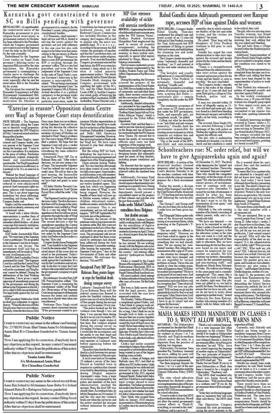 Crescent Kashmir 18-04-2025 Page: 3 April 18, 2025 << First << 3 >> Last >> Page 1Page 2Page 3Page 4Page 5Page 6Page 7Page 8 × Crescent Kashmir 18-04-2025 << First << 3 >> Last >> CK 1CK 2CK 3CK 4CK 5CK 6CK 7CK 8 CK 3