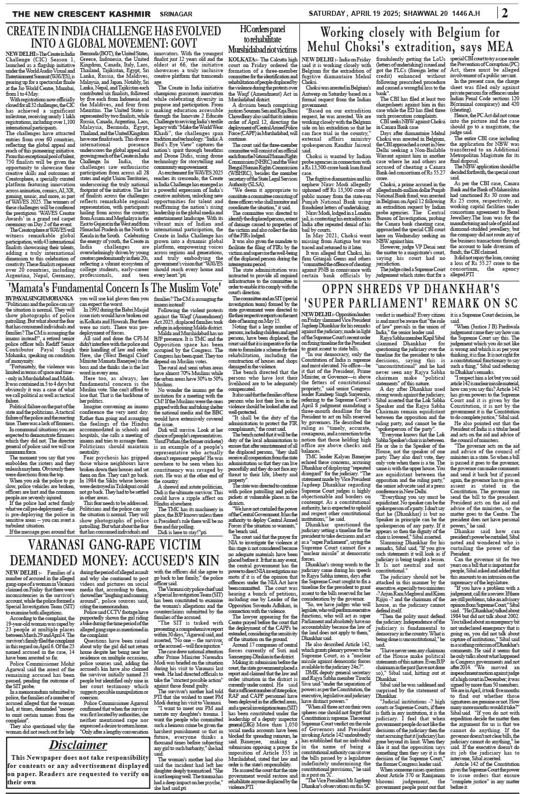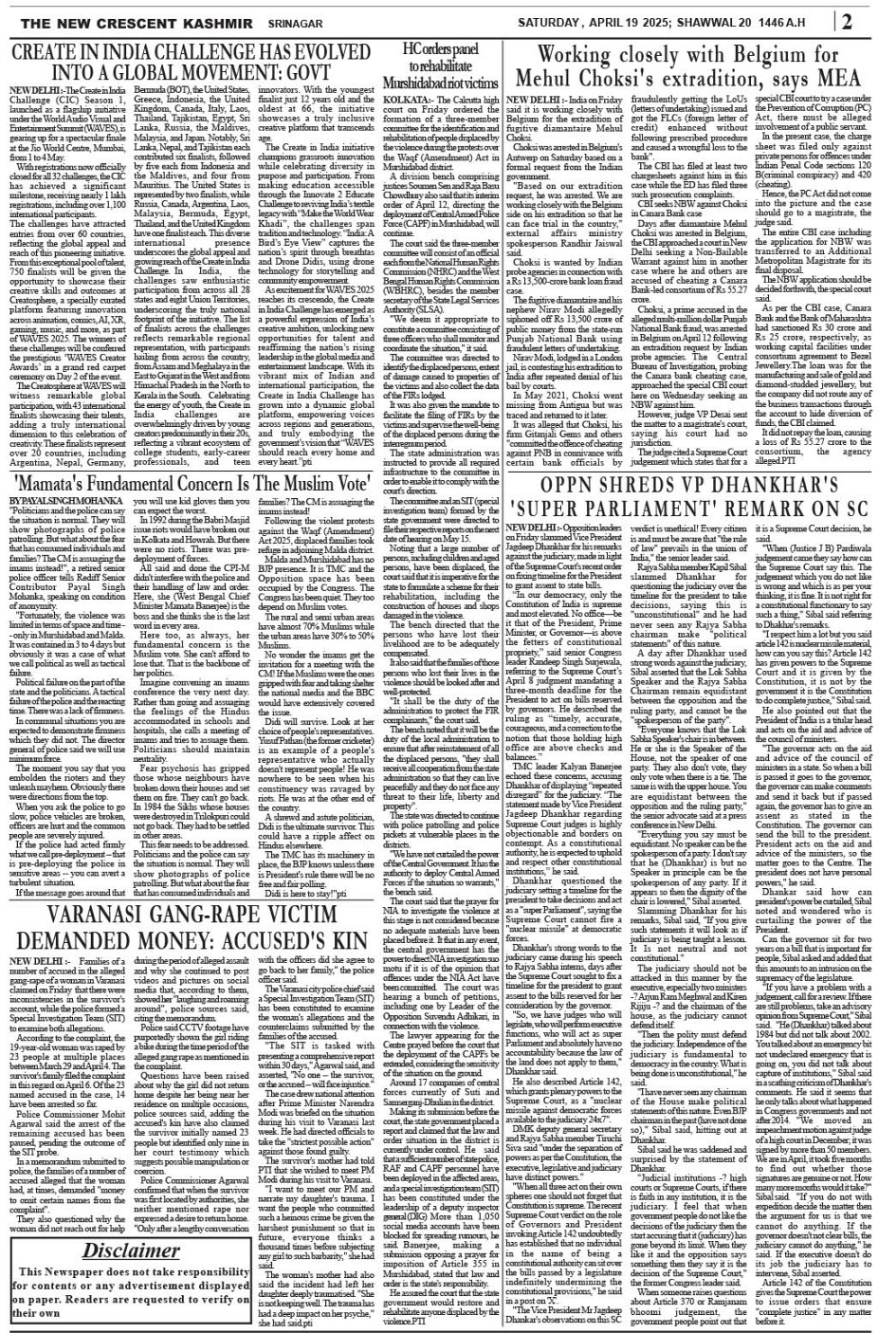 Crescent Kashmir 19-04-2025 Page: 2 April 19, 2025 << First << 2 >> Last >> Page 1Page 2Page 3Page 4Page 5Page 6Page 7Page 8 × Crescent Kashmir 19-04-2025 << First << 2 >> Last >> CK 1CK 2CK 3CK 4CK 5CK 6CK 7CK 8 CK 2