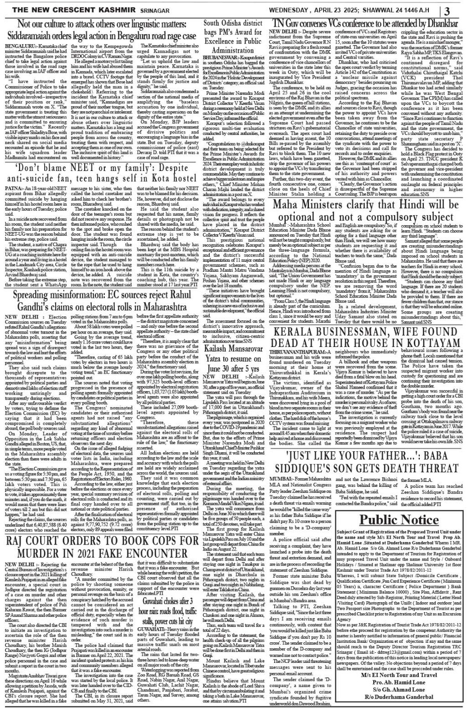Crescent Kashmir 23-04-2025 Page: 3 April 23, 2025 << First << 3 >> Last >> Page 1Page 2Page 3Page 4Page 5Page 6Page 7Page 8 × Crescent Kashmir 23-04-2025 << First << 3 >> Last >> CK 1CK 2CK 3CK 4CK 5CK 6CK 7CK 8 CK 3