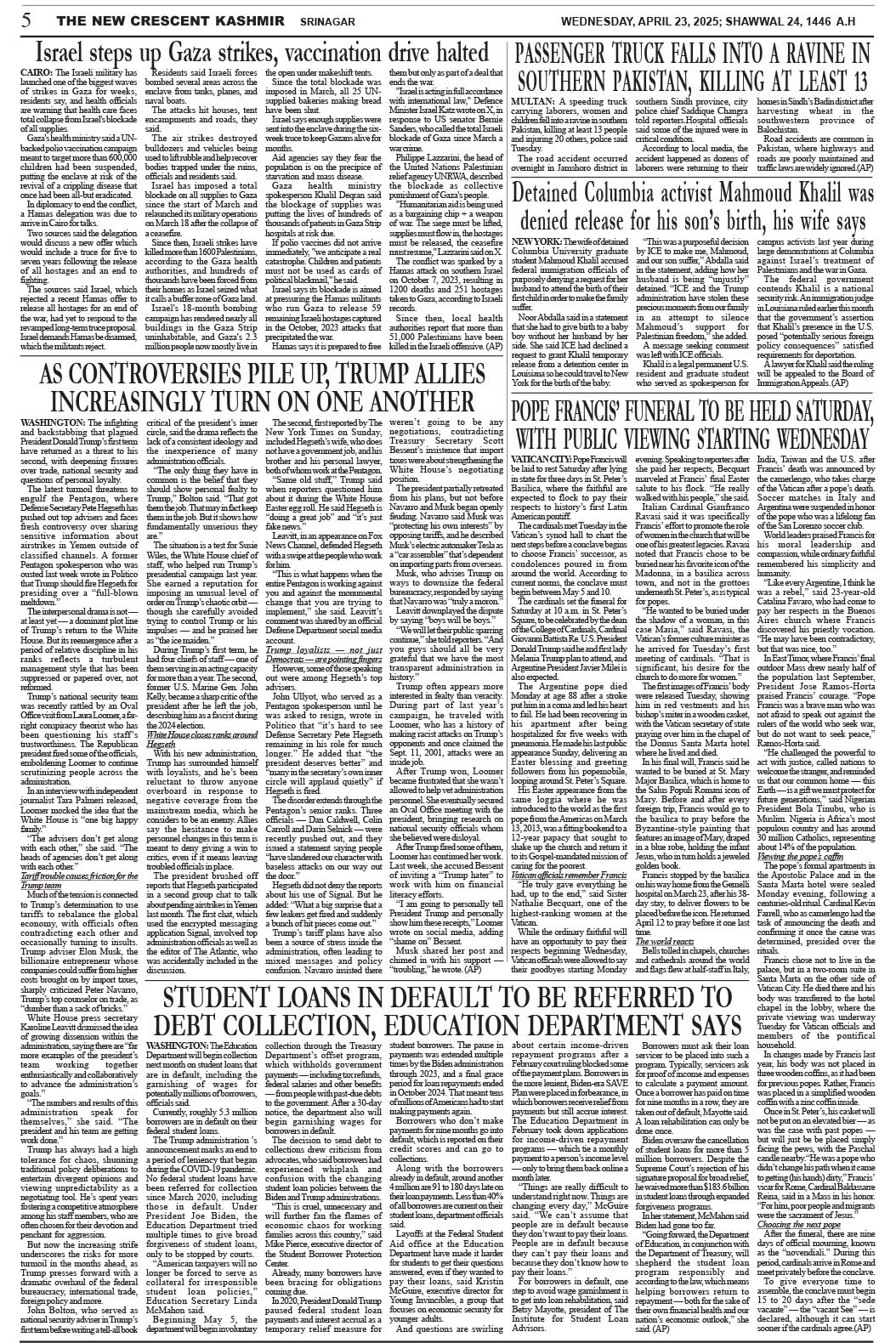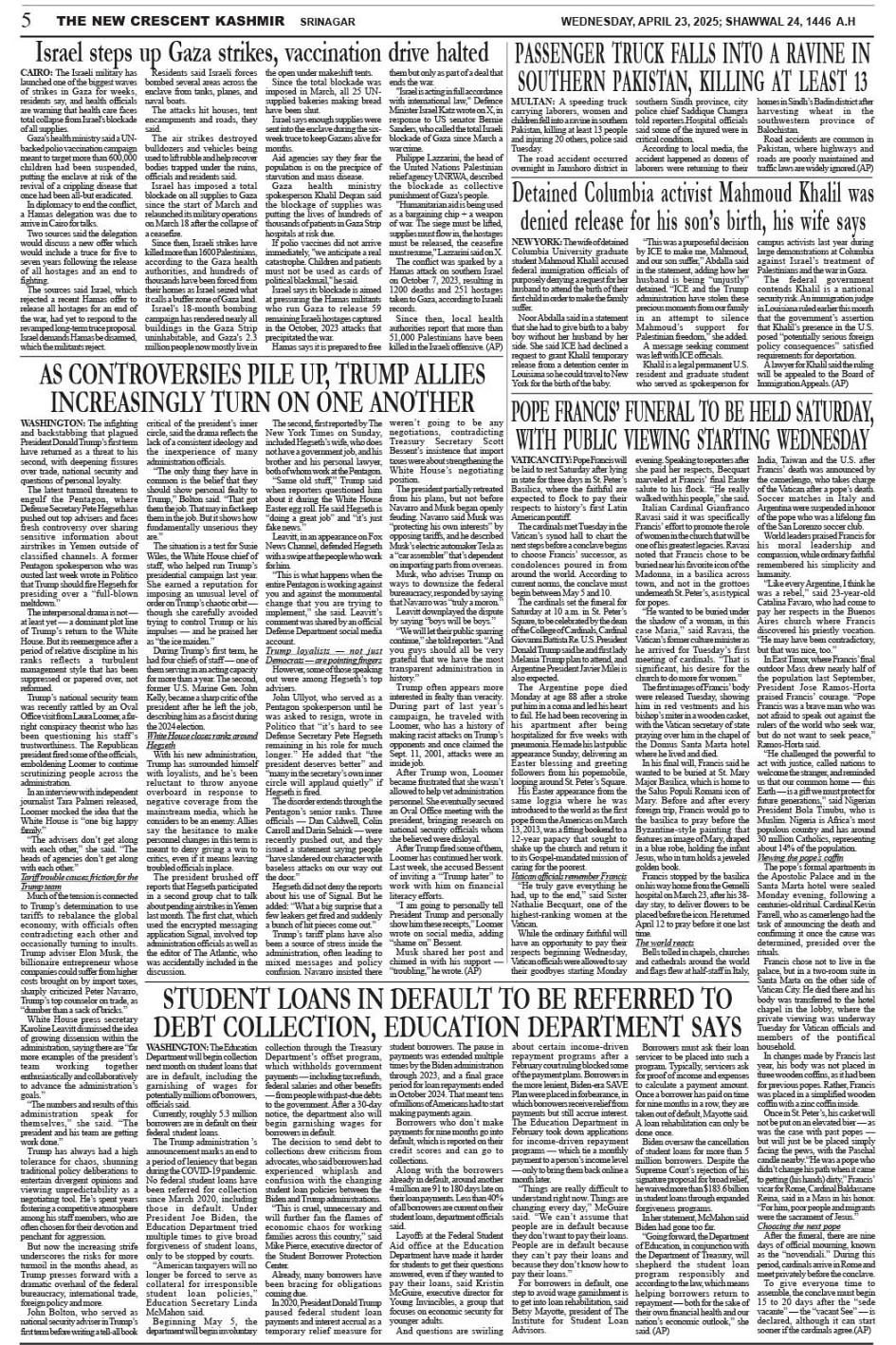 Crescent Kashmir 23-04-2025 Page: 5 April 23, 2025 << First << 5 >> Last >> Page 1Page 2Page 3Page 4Page 5Page 6Page 7Page 8 × Crescent Kashmir 23-04-2025 << First << 5 >> Last >> CK 1CK 2CK 3CK 4CK 5CK 6CK 7CK 8 CK 5