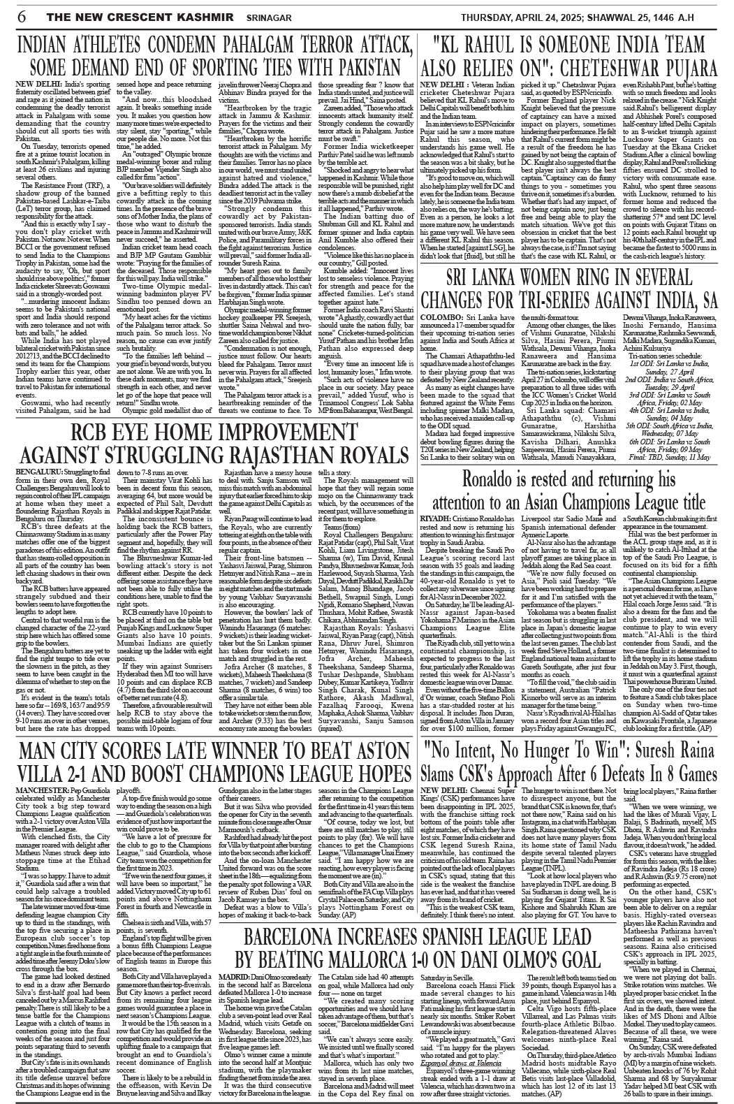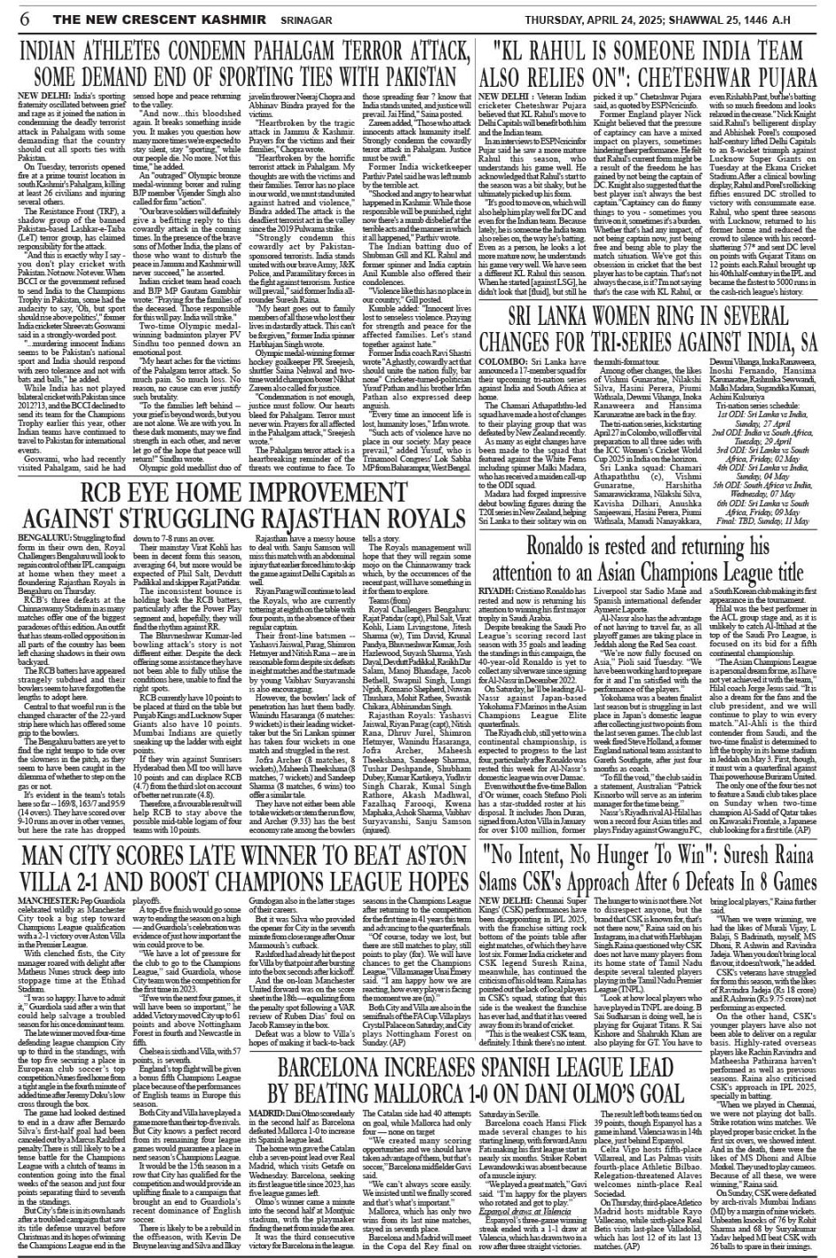 Crescent Kashmir 24-04-2025 Page: 6 April 24, 2025 << First << 6 >> Last >> Page 1Page 2Page 3Page 4Page 5Page 6Page 7Page 8 × Crescent Kashmir 24-04-2025 << First << 6 >> Last >> CK 1CK 2CK 3CK 4CK 5CK 6CK 7CK 8 CK 6