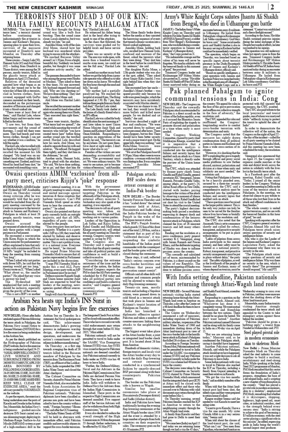 Crescent Kashmir 25-04-2025 Page: 2 April 25, 2025 << First << 2 >> Last >> Page 1Page 2Page 3Page 4Page 5Page 6Page 7Page 8 × Crescent Kashmir 25-04-2025 << First << 2 >> Last >> CK 1CK 2CK 3CK 4CK 5CK 6CK 7CK 8 CK 2