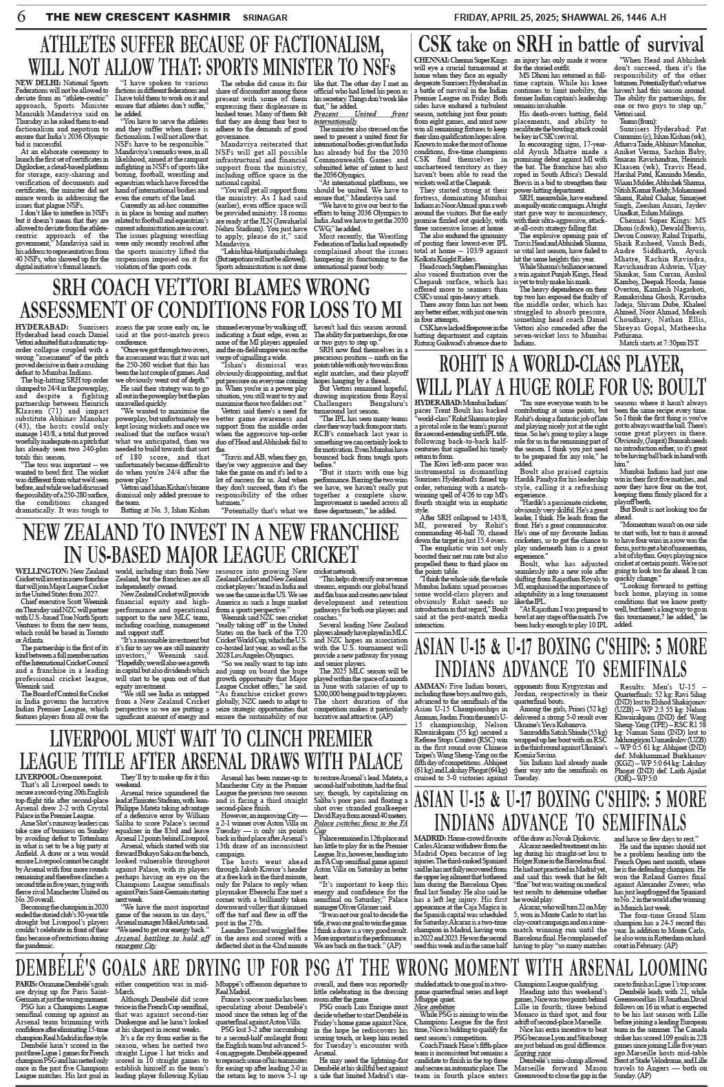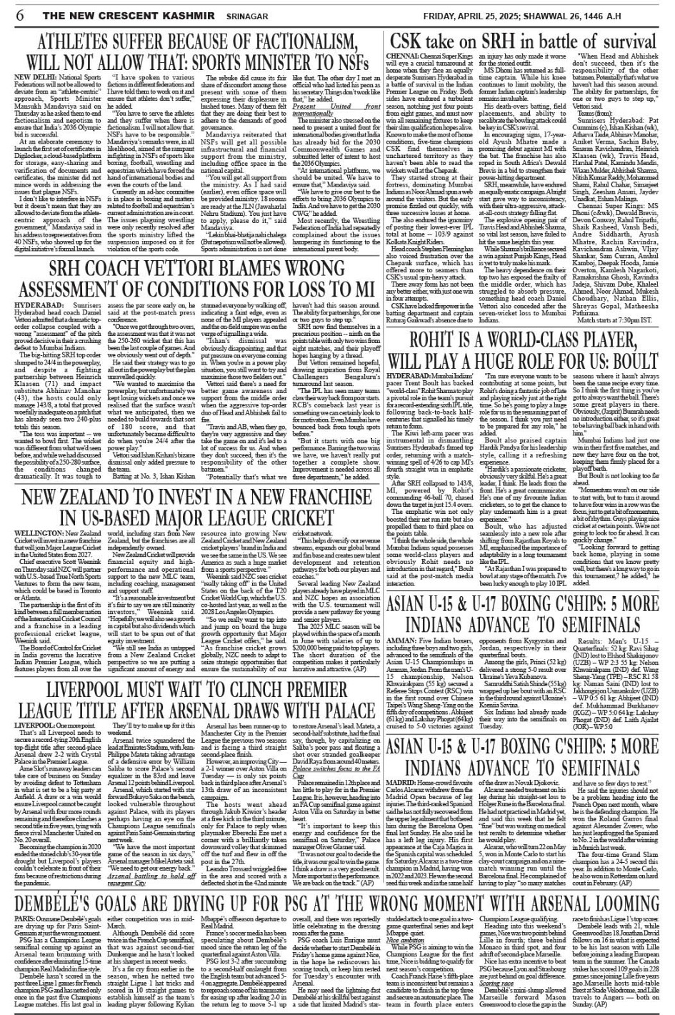 Crescent Kashmir 25-04-2025 Page: 6 April 25, 2025 << First << 6 >> Last >> Page 1Page 2Page 3Page 4Page 5Page 6Page 7Page 8 × Crescent Kashmir 25-04-2025 << First << 6 >> Last >> CK 1CK 2CK 3CK 4CK 5CK 6CK 7CK 8 CK 6