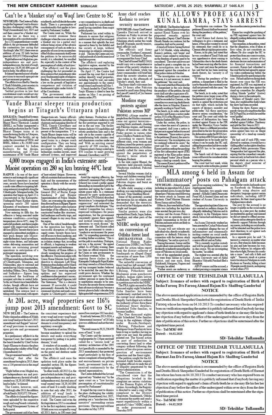 Crescent Kashmir 26-04-2025 Page: 3 April 26, 2025 << First << 3 >> Last >> Page 1Page 2Page 3Page 4Page 5Page 6Page 7Page 8 × Crescent Kashmir 26-04-2025 << First << 3 >> Last >> CK 1CK 2CK 3CK 4CK 5CK 6CK 7CK 8 CK 3