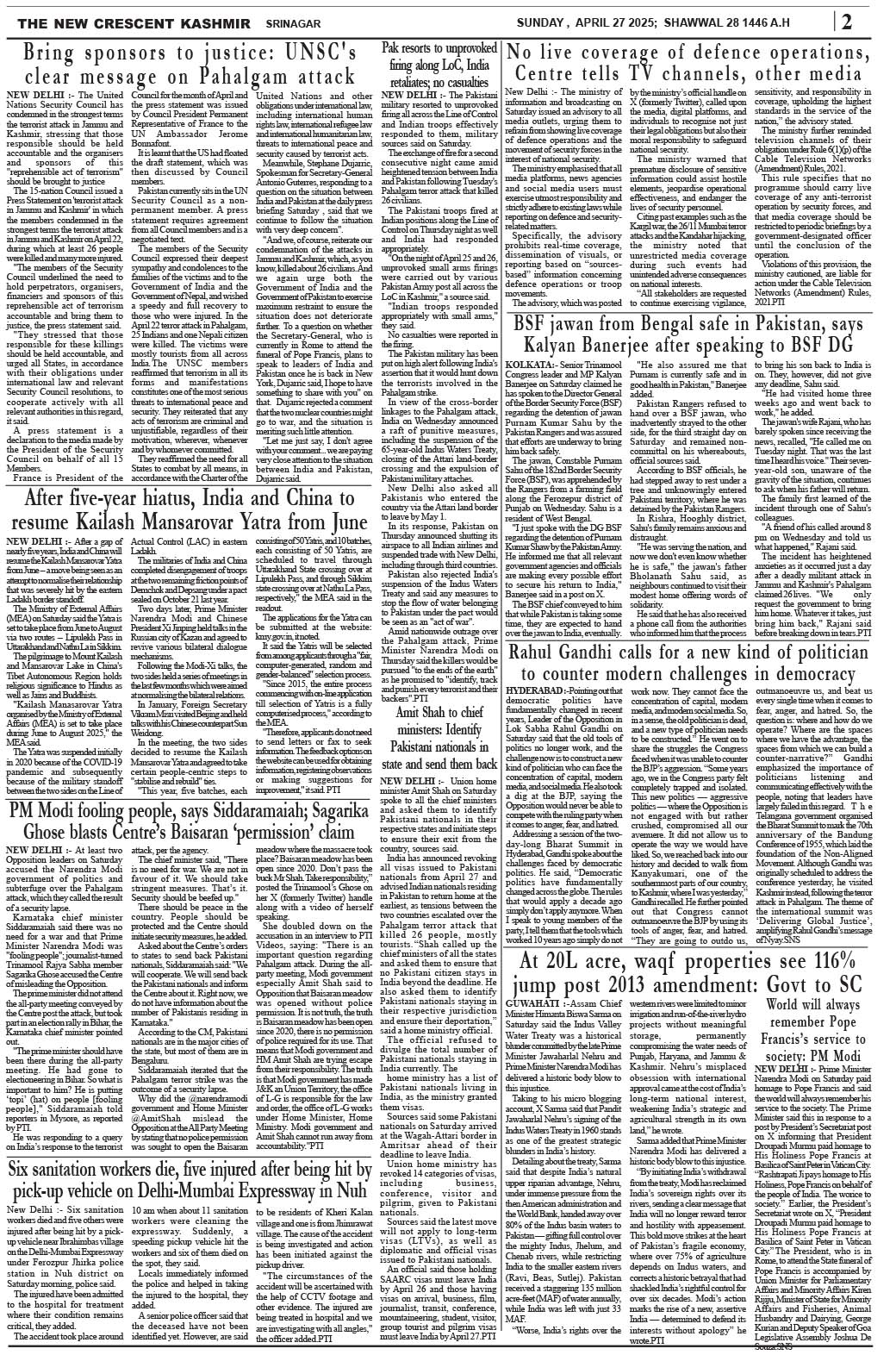 Crescent Kashmir 27-04-2025 Page: 2 April 27, 2025 << First << 2 >> Last >> Page 1Page 2Page 3Page 4Page 5Page 6Page 7Page 8 × Crescent Kashmir 27-04-2025 << First << 2 >> Last >> CK 1CK 2CK 3CK 4CK 5CK 6CK 7CK 8 CK 2