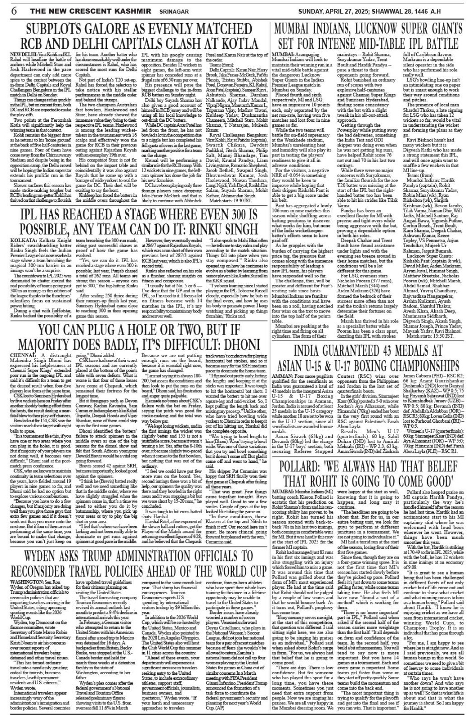 Crescent Kashmir 27-04-2025 Page: 6 April 27, 2025 << First << 6 >> Last >> Page 1Page 2Page 3Page 4Page 5Page 6Page 7Page 8 × Crescent Kashmir 27-04-2025 << First << 6 >> Last >> CK 1CK 2CK 3CK 4CK 5CK 6CK 7CK 8 CK 6