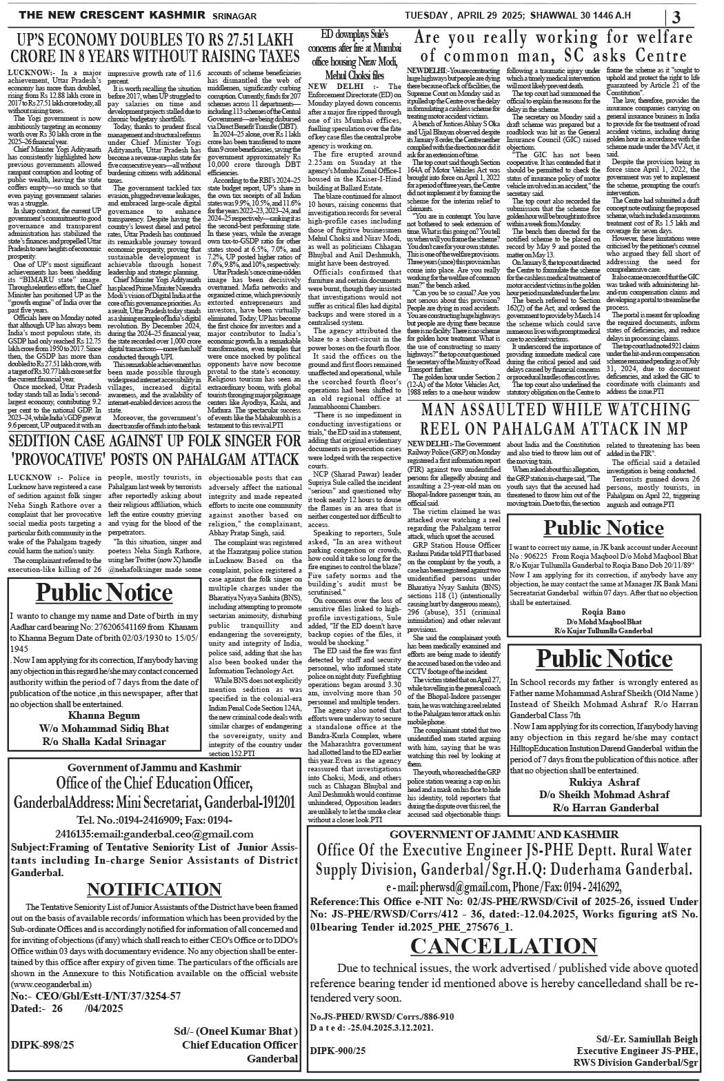 Crescent Kashmir 29-04-2025 Page: 3 April 29, 2025 << First << 3 >> Last >> Page 1Page 2Page 3Page 4Page 5Page 6Page 7Page 8 × Crescent Kashmir 29-04-2025 << First << 3 >> Last >> CK 1CK 2CK 3CK 4CK 5CK 6CK 7CK 8 CK 3