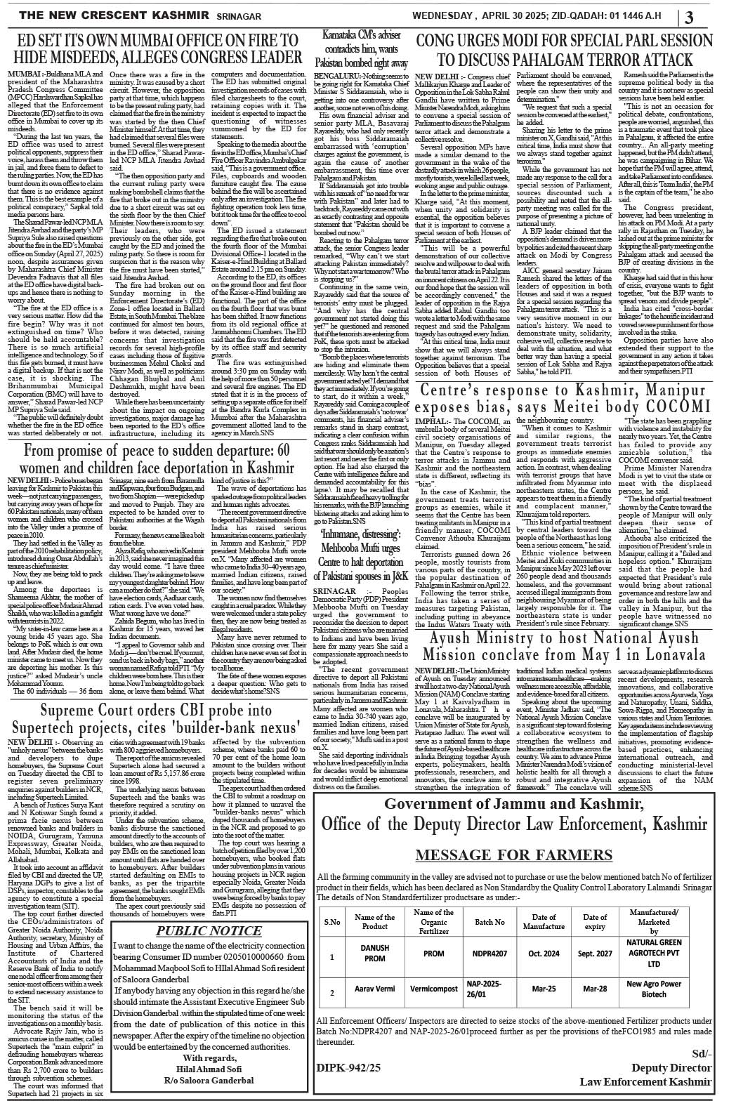 Crescent Kashmir 30-04-2025 Page: 3 April 30, 2025 << First << 3 >> Last >> Page 1Page 2Page 3Page 4Page 5Page 6Page 7Page 8 × Crescent Kashmir 30-04-2025 << First << 3 >> Last >> CK 1CK 2CK 3CK 4CK 5CK 6CK 7CK 8 CK 3