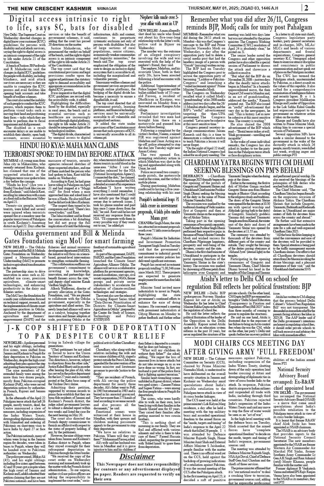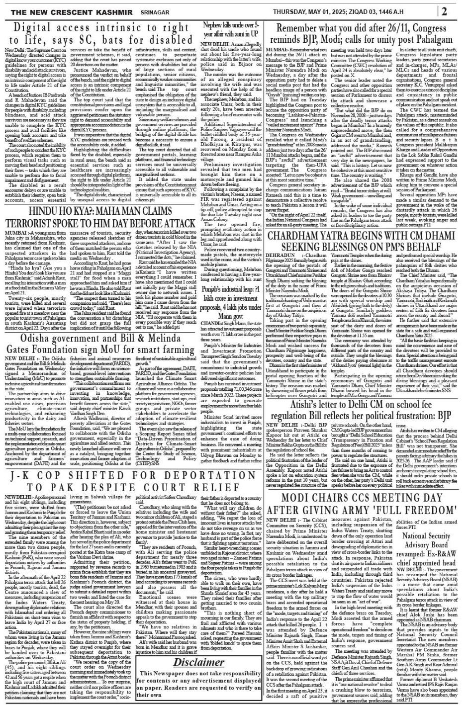 Crescent Kashmir 01-05-2025 Page: 2 May 01, 2025 << First << 2 >> Last >> Page 1Page 2Page 3Page 4Page 5Page 6Page 7Page 8 × Crescent Kashmir 01-05-2025 << First << 2 >> Last >> CK 1CK 2CK 3CK 4CK 5CK 6CK 7CK 8 CK 2