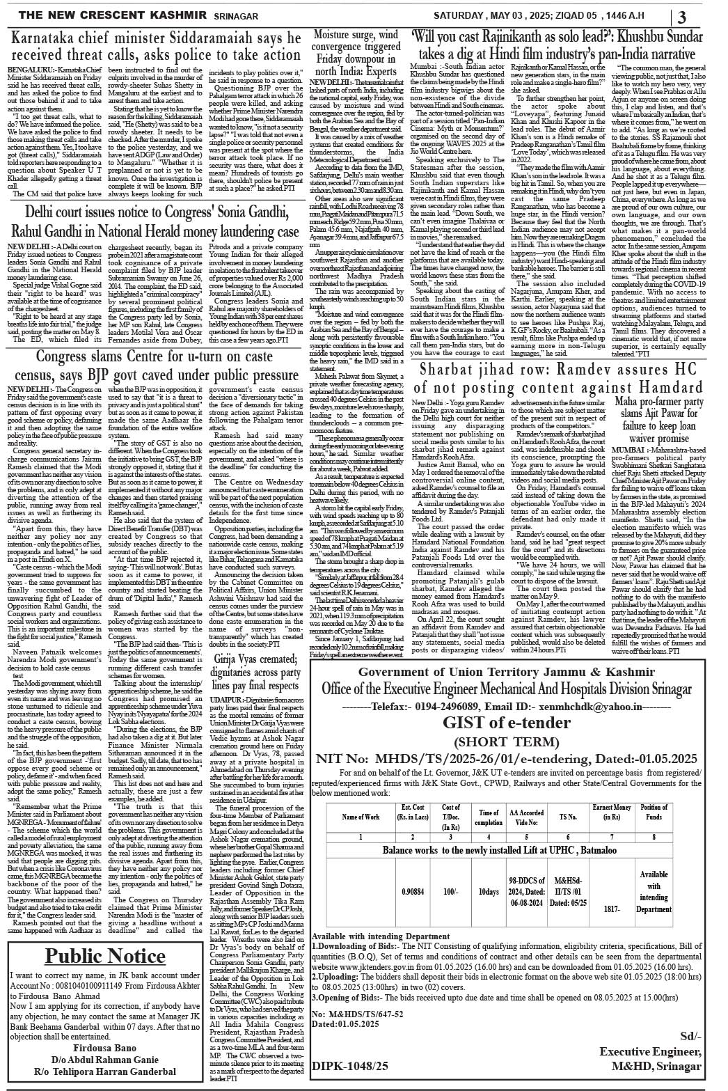 Crescent Kashmir 03-05-2025 Page: 3 May 03, 2025 << First << 3 >> Last >> Page 1Page 2Page 3Page 4Page 5Page 6Page 7Page 8 × Crescent Kashmir 03-05-2025 << First << 3 >> Last >> CK 1CK 2CK 3CK 4CK 5CK 6CK 7CK 8 CK 3