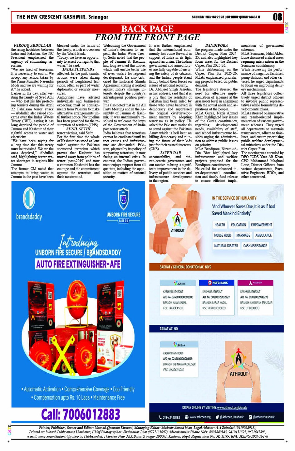 Crescent Kashmir 04-05-2025 Page: 8 May 04, 2025 << First << 8 >> Last >> Page 1Page 2Page 3Page 4Page 5Page 6Page 7Page 8 × Crescent Kashmir 04-05-2025 << First << 8 >> Last >> CK 1CK 2CK 3CK 4CK 5CK 6CK 7CK 8 CK 8