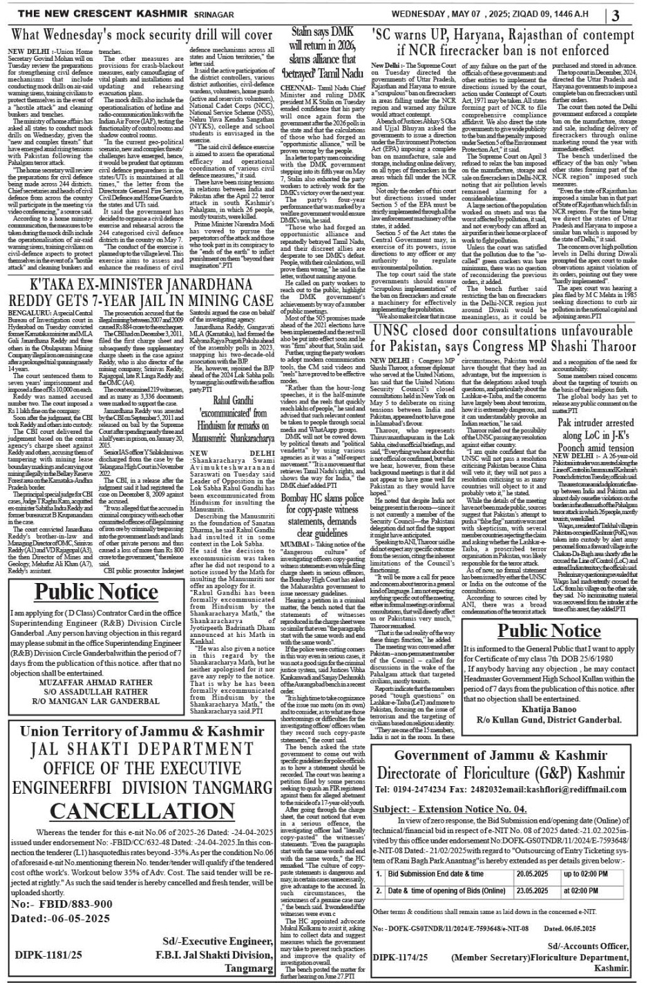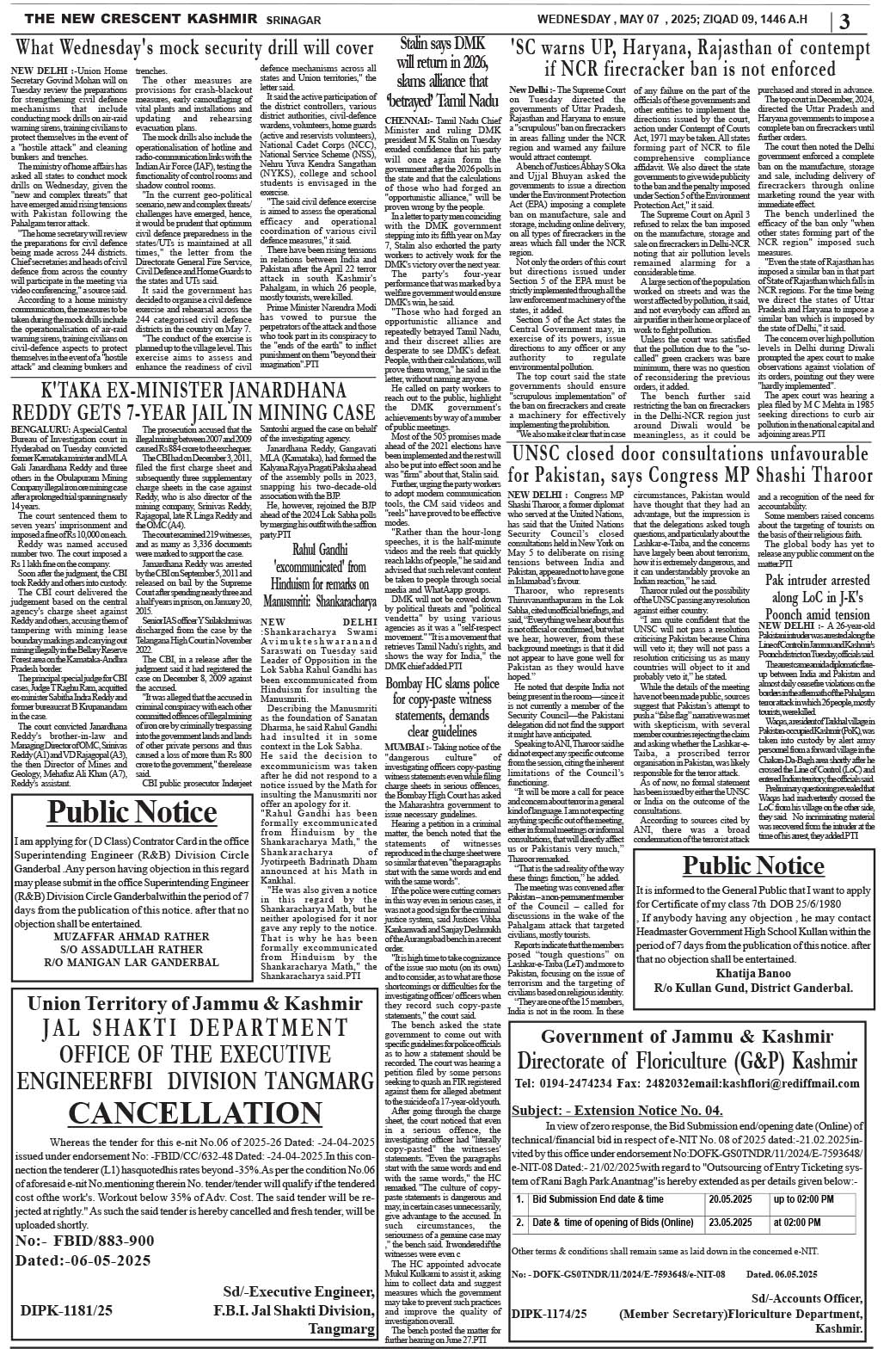 Crescent Kashmir 07-05-2025 Page: 3 May 07, 2025 << First << 3 >> Last >> Page 1Page 2Page 3Page 4Page 5Page 6Page 7Page 8 × Crescent Kashmir 07-05-2025 << First << 3 >> Last >> CK 1CK 2CK 3CK 4CK 5CK 6CK 7CK 8 CK 3