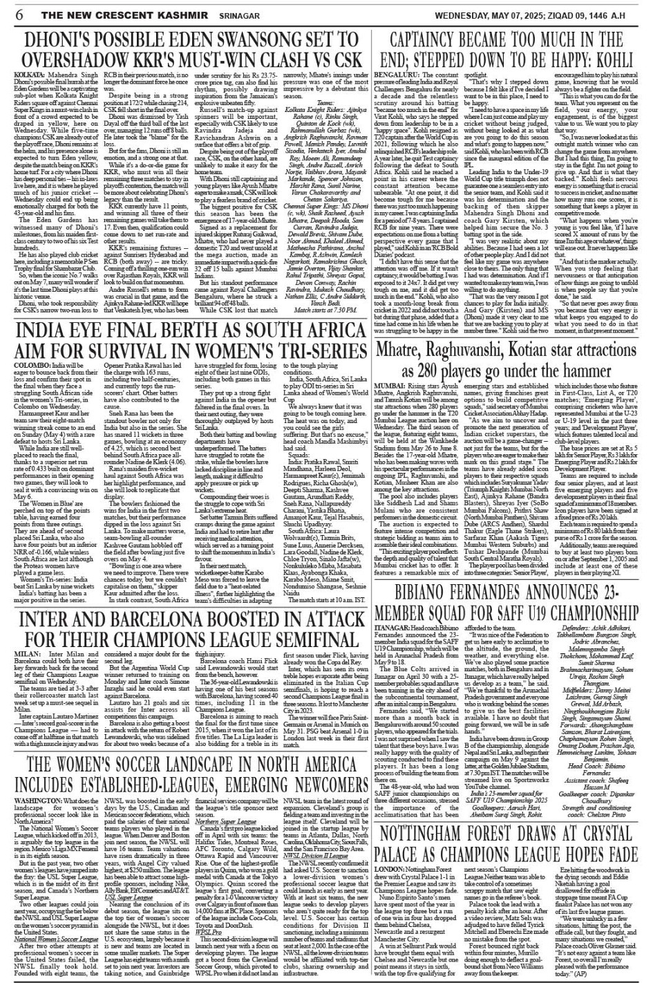 Crescent Kashmir 07-05-2025 Page: 6 May 07, 2025 << First << 6 >> Last >> Page 1Page 2Page 3Page 4Page 5Page 6Page 7Page 8 × Crescent Kashmir 07-05-2025 << First << 6 >> Last >> CK 1CK 2CK 3CK 4CK 5CK 6CK 7CK 8 CK 6