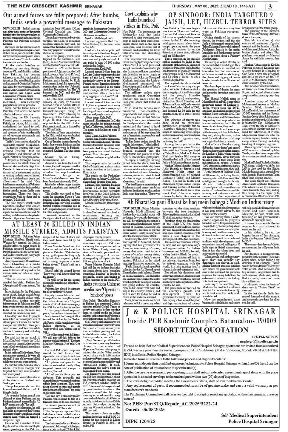 Crescent Kashmir 08-05-2025 Page: 3 May 08, 2025 << First << 3 >> Last >> Page 1Page 2Page 3Page 4Page 5Page 6Page 7Page 8 × Crescent Kashmir 08-05-2025 << First << 3 >> Last >> CK 1CK 2CK 3CK 4CK 5CK 6CK 7CK 8 CK 3