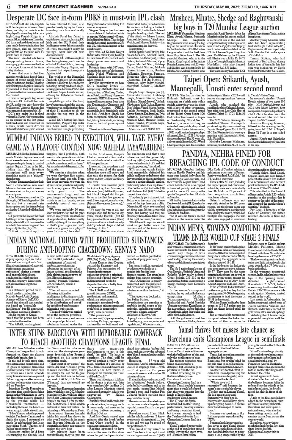 Crescent Kashmir 08-05-2025 Page: 6 May 08, 2025 << First << 6 >> Last >> Page 1Page 2Page 3Page 4Page 5Page 6Page 7Page 8 × Crescent Kashmir 08-05-2025 << First << 6 >> Last >> CK 1CK 2CK 3CK 4CK 5CK 6CK 7CK 8 CK 6