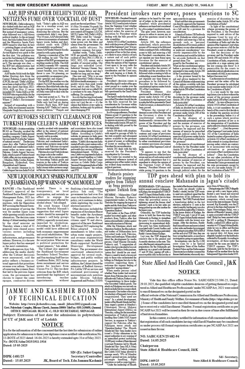 Crescent Kashmir 16-05-2025 Page: 3 May 16, 2025 << First << 3 >> Last >> Page 1Page 2Page 3Page 4Page 5Page 6Page 7Page 8 × Crescent Kashmir 16-05-2025 << First << 3 >> Last >> CK 1CK 2CK 3CK 4CK 5CK 6CK 7CK 8 CK 3