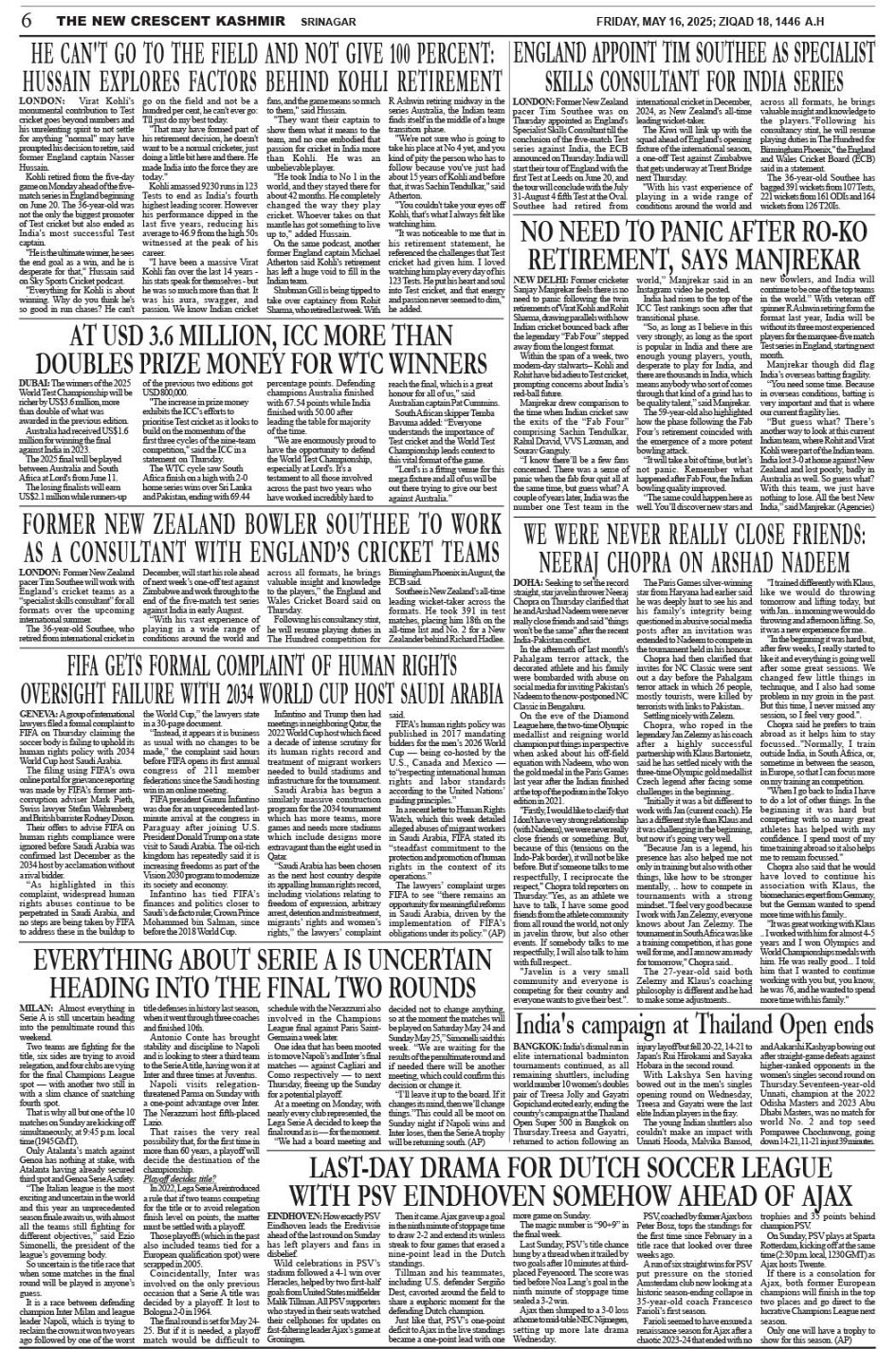 Crescent Kashmir 16-05-2025 Page: 6 May 16, 2025 << First << 6 >> Last >> Page 1Page 2Page 3Page 4Page 5Page 6Page 7Page 8 × Crescent Kashmir 16-05-2025 << First << 6 >> Last >> CK 1CK 2CK 3CK 4CK 5CK 6CK 7CK 8 CK 6