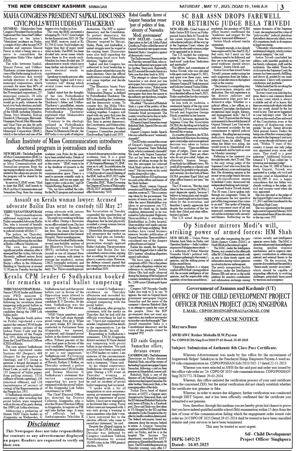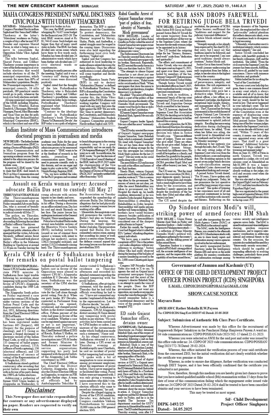 Crescent Kashmir 17-05-2025 Page: 3 May 17, 2025 << First << 3 >> Last >> Page 1Page 2Page 3Page 4Page 5Page 6Page 7Page 8 × Crescent Kashmir 17-05-2025 << First << 3 >> Last >> CK 1CK 2CK 3CK 4CK 5CK 6CK 7CK 8 CK 3