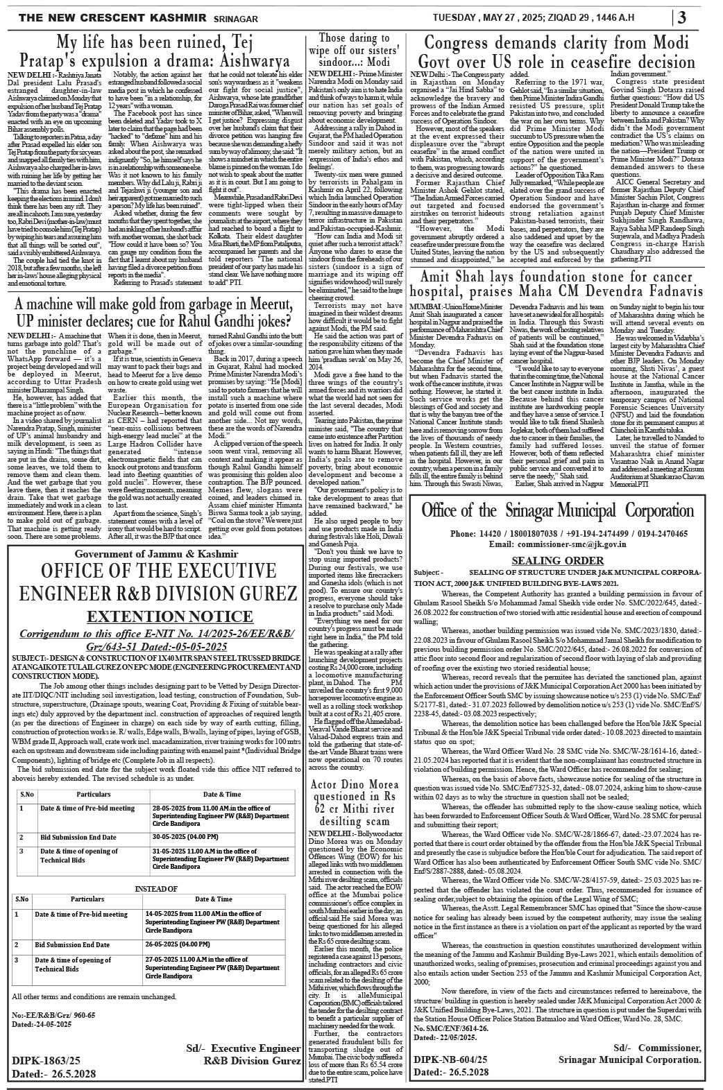 Crescent Kashmir 27-05-2025 Page: 3 May 27, 2025 << First << 3 >> Last >> Page 1Page 2Page 3Page 4Page 5Page 6Page 7Page 8 × Crescent Kashmir 27-05-2025 << First << 3 >> Last >> CK 1CK 2CK 3CK 4CK 5CK 6CK 7CK 8 CK 3