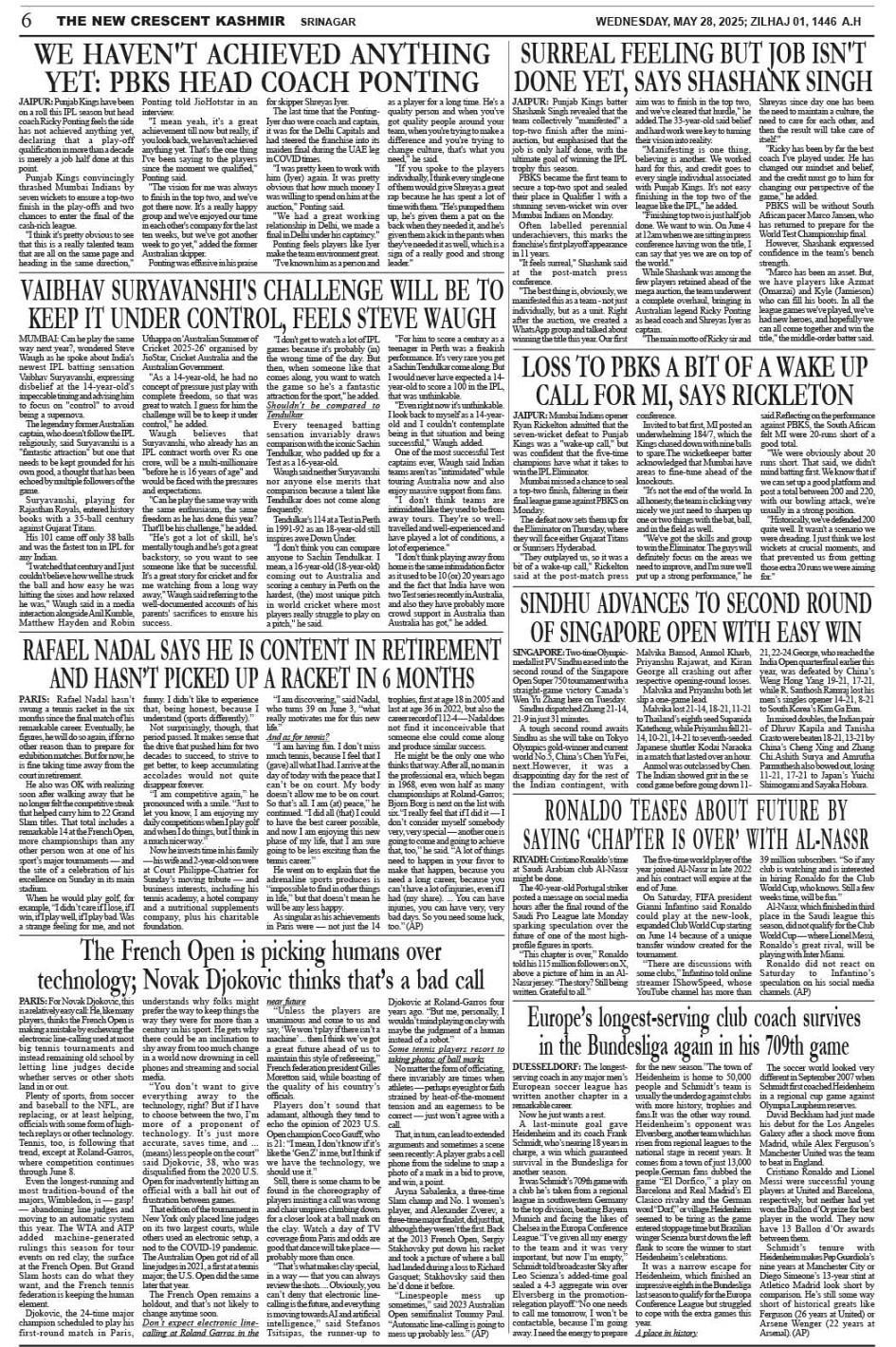 Crescent Kashmir 28-05-2025 Page: 6 May 28, 2025 << First << 6 >> Last >> Page 1Page 2Page 3Page 4Page 5Page 6Page 7Page 8 × Crescent Kashmir 28-05-2025 << First << 6 >> Last >> CK 1CK 2CK 3CK 4CK 5CK 6CK 7CK 8 CK 6