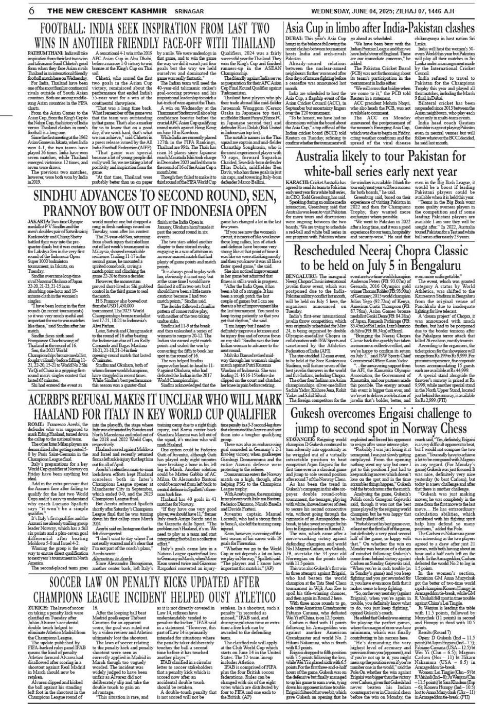 Crescent Kashmir 04-06-2025 Page: 6 June 04, 2025 << First << 6 >> Last >> Page 1Page 2Page 3Page 4Page 5Page 6Page 7Page 8 × Crescent Kashmir 04-06-2025 << First << 6 >> Last >> CK 1CK 2CK 3CK 4CK 5CK 6CK 7CK 8 CK 6