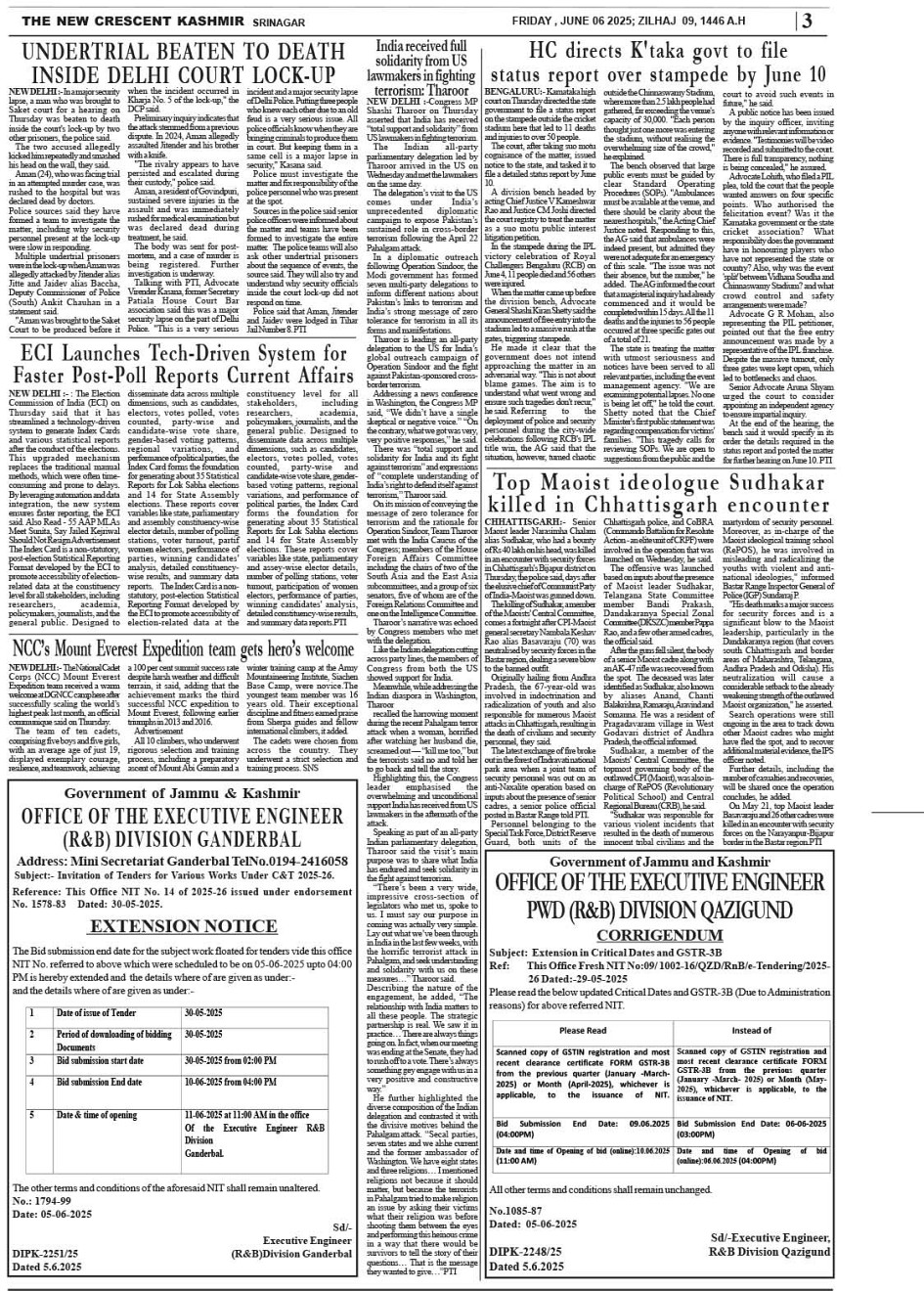 Crescent Kashmir 06-06-2025 Page: 3 June 06, 2025 << First << 3 >> Last >> Page 1Page 2Page 3Page 4Page 5Page 6Page 7Page 8 × Crescent Kashmir 06-06-2025 << First << 3 >> Last >> CK 1CK 2CK 3aCK 4CK 5CK 6CK 7CK 8 CK 3a