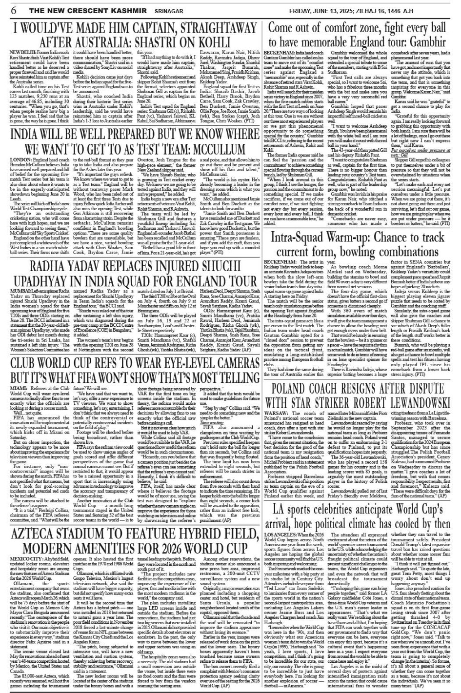 Crescent Kashmir 13-06-2025 Page: 6 June 13, 2025 << First << 6 >> Last >> Page 1Page 2Page 3Page 4Page 5Page 6Page 7Page 8 × Crescent Kashmir 13-06-2025 << First << 6 >> Last >> CK 1CK 2CK 3CK 4CK 5CK 6CK 7CK 8 CK 6