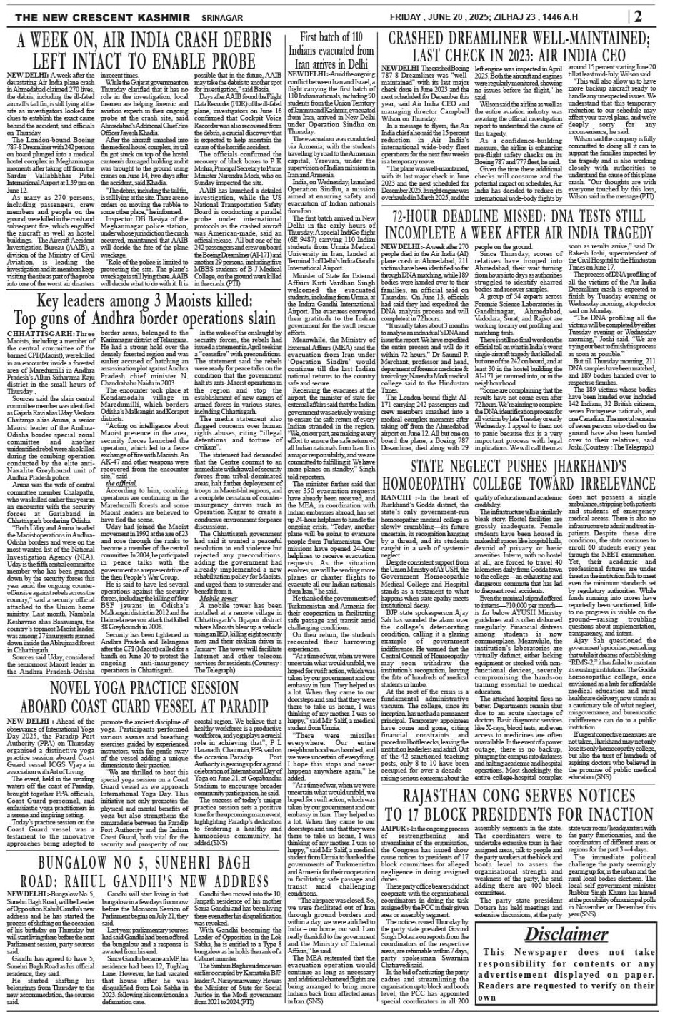 Crescent Kashmir 20-06-2025 Page: 2 June 20, 2025 << First << 2 >> Last >> Page 1Page 2Page 3Page 4Page 5Page 6Page 7Page 8 × Crescent Kashmir 20-06-2025 << First << 2 >> Last >> CK 1CK 2CK 3CK 4CK 5CK 6CK 7CK 8 CK 2