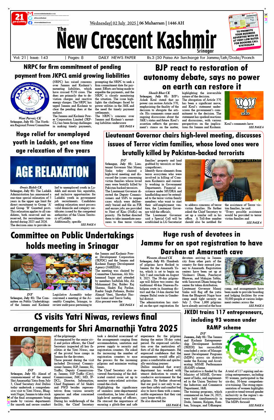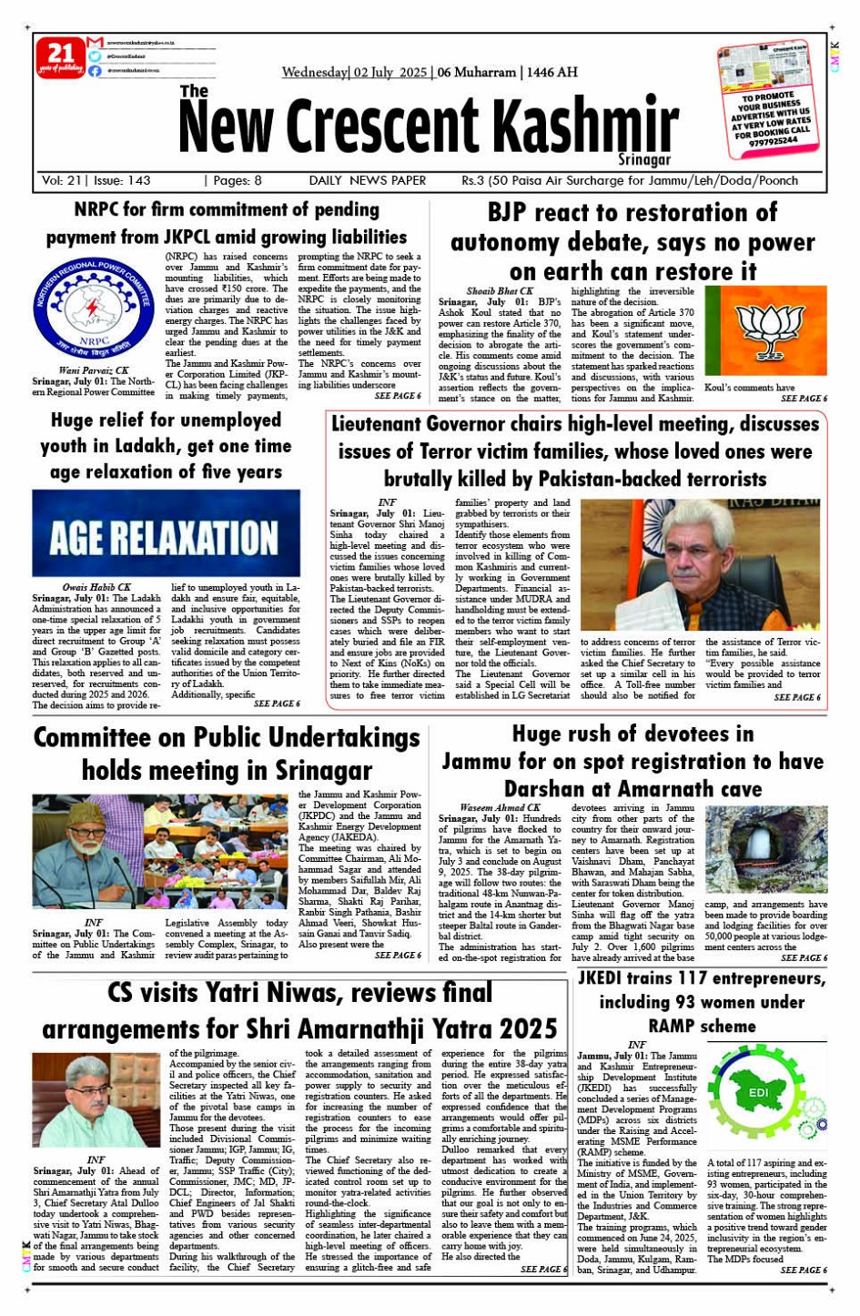 Crescent Kashmir 02-07-2025 Page: 3 July 02, 2025 << First << 3 >> Last >> Page 1Page 2Page 3Page 4Page 5Page 6Page 7Page 8 × Crescent Kashmir 02-07-2025 << First << 3 >> Last >> CK 1CK 2CK 3CK 4CK 5CK 6CK 7CK 8 CK 3