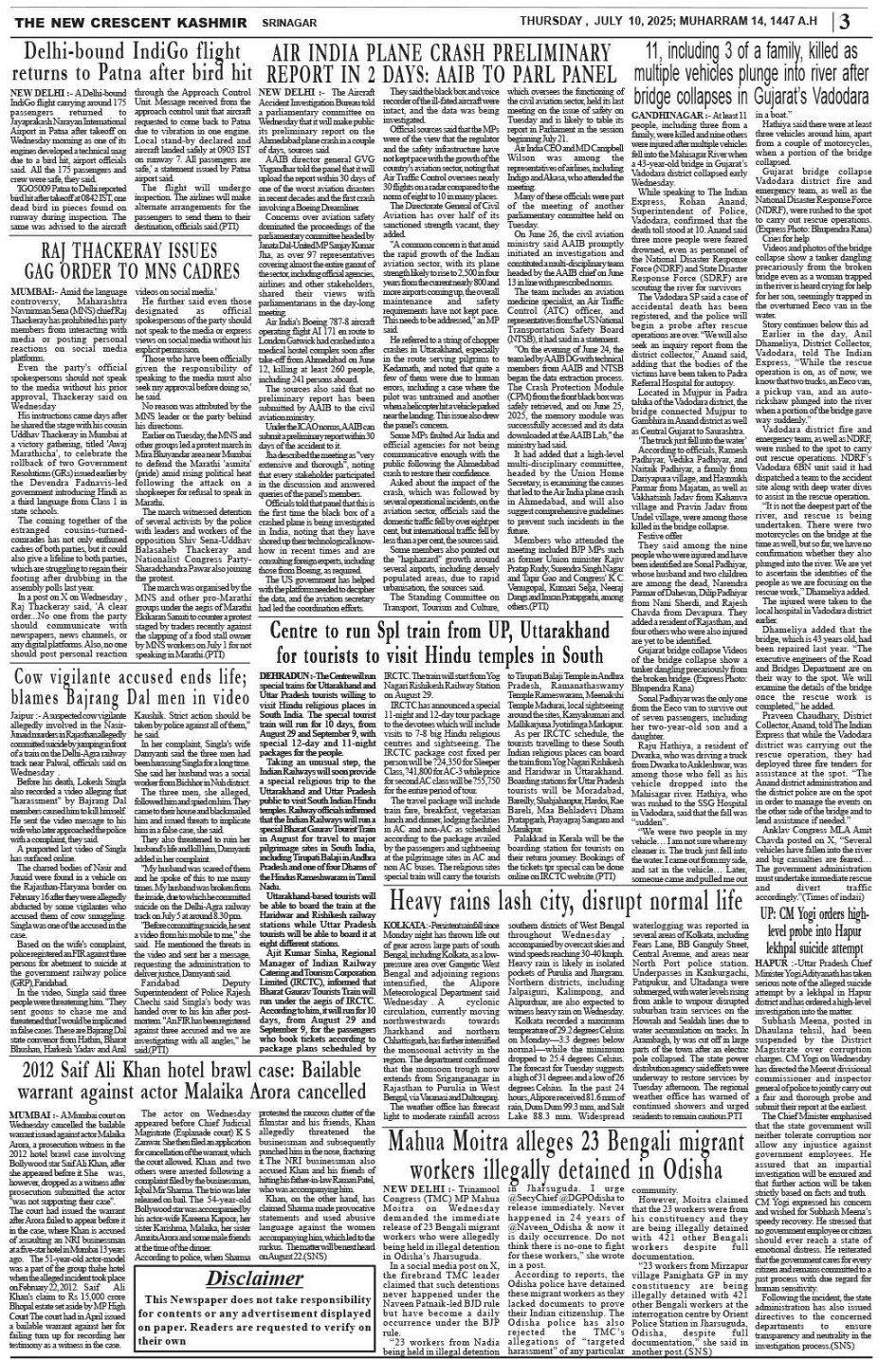 Crescent Kashmir 10-07-2025 Page: 3 July 10, 2025 << First << 3 >> Last >> Page 1Page 2Page 3Page 4Page 5Page 6Page 7Page 8 × Crescent Kashmir 10-07-2025 << First << 3 >> Last >> CK 1CK 2CK 3CK 4CK 5CK 6CK 7CK 8 CK 3